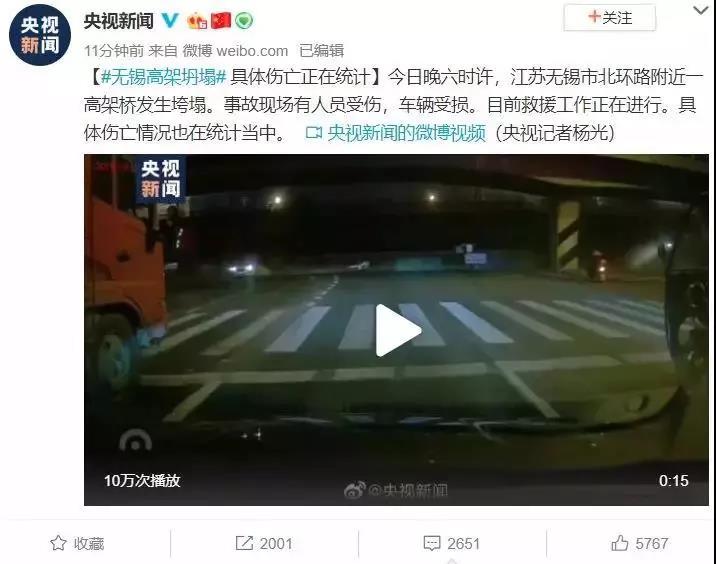 據(jù)揚子晚報,晚上6點半左右,312國道上海方向錫港路上跨橋路段橋面垮塌,通行受阻,后方車輛大量積壓擁堵。視頻內(nèi)容顯示,垮塌現(xiàn)場車輛通行受阻,有車輛被壓。據(jù)媒體記者了解到,有目擊者稱,當時有一輛數(shù)百噸的重型運輸車駛上高架橋,車上裝載的貨物為鋼制卷板。目前,無錫市主要領(lǐng)導已赴現(xiàn)場,多個部門已緊急出動,展開事件調(diào)查。目擊者許某某(化名)告訴記者,事故路段平時便是無錫的交通要道之一,車流量非常大,而今日事故發(fā)生時,正處于下班晚高峰,所以從現(xiàn)場能看到有多輛汽車被垮塌的橋段壓住。從@無錫交通廣播 發(fā)布的現(xiàn)場圖片及視頻顯示,有一輛小汽車的駕駛艙位置被橋壓住。另據(jù)報道,除了轎車被壓在橋下,一輛拉著鋼卷的貨車也掉了下來。