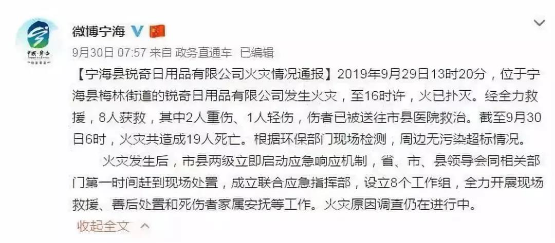 9月30日7時(shí)57分,寧??h委相關(guān)部門發(fā)布通告,稱在此次火災(zāi)中,經(jīng)全力救援,8人獲救,其中2人重傷、1人輕傷,傷者已被送往市縣醫(yī)院救治。截至9月30日6時(shí),火災(zāi)共造成19人死亡。