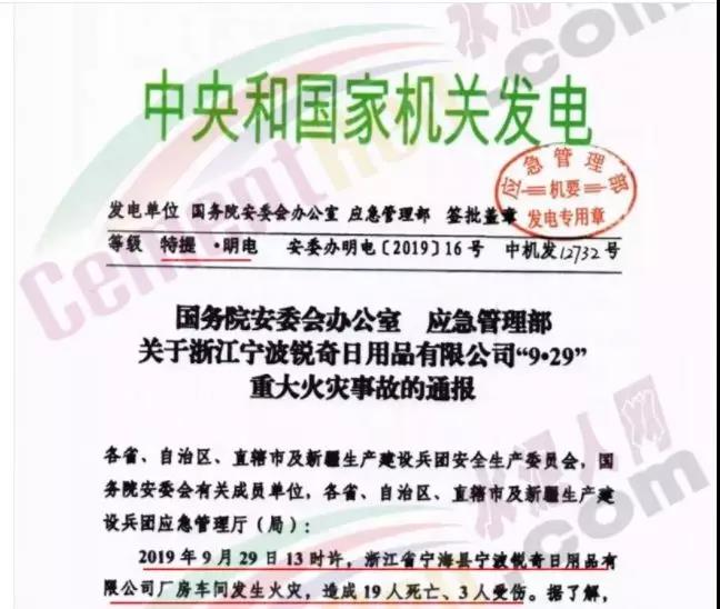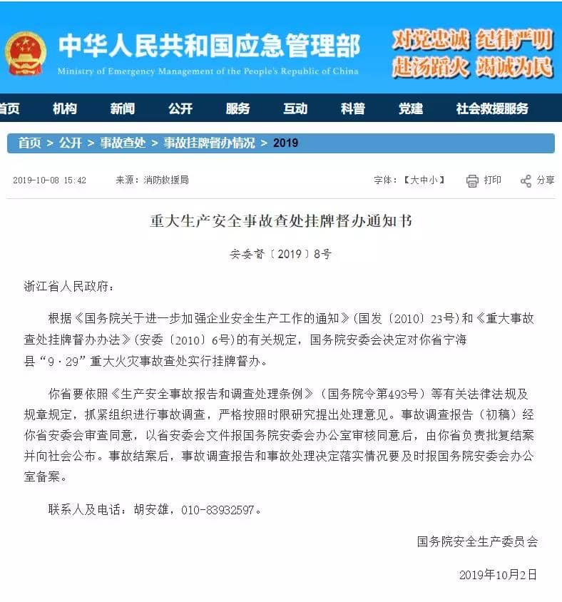 10月8日國(guó)家應(yīng)急管理部官網(wǎng)發(fā)布來(lái)自于消防救援局的《重大生產(chǎn)安全事故查處掛牌督辦通知書》(安委督﹝2019﹞8號(hào))提到根據(jù)《國(guó)務(wù)院關(guān)于進(jìn)一步加強(qiáng)企業(yè)安全生產(chǎn)工作的通知》(國(guó)發(fā)﹝2010﹞23號(hào))和《重大事故查處掛牌督辦辦法》(安委﹝2010﹞6號(hào))的有關(guān)規(guī)定,國(guó)務(wù)院安委會(huì)決定對(duì)浙江省寧波市寧??h“9·29”重大火災(zāi)事故查處實(shí)行掛牌督辦。通知要求浙江省依照《生產(chǎn)安全事故報(bào)告和調(diào)查處理?xiàng)l例》(國(guó)務(wù)院令第493號(hào))等有關(guān)法律法規(guī)及規(guī)章規(guī)定,抓緊組織進(jìn)行事故調(diào)查,嚴(yán)格按照時(shí)限研究提出處理意見(jiàn)。