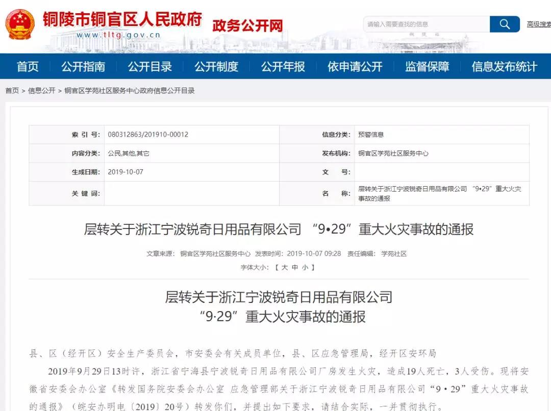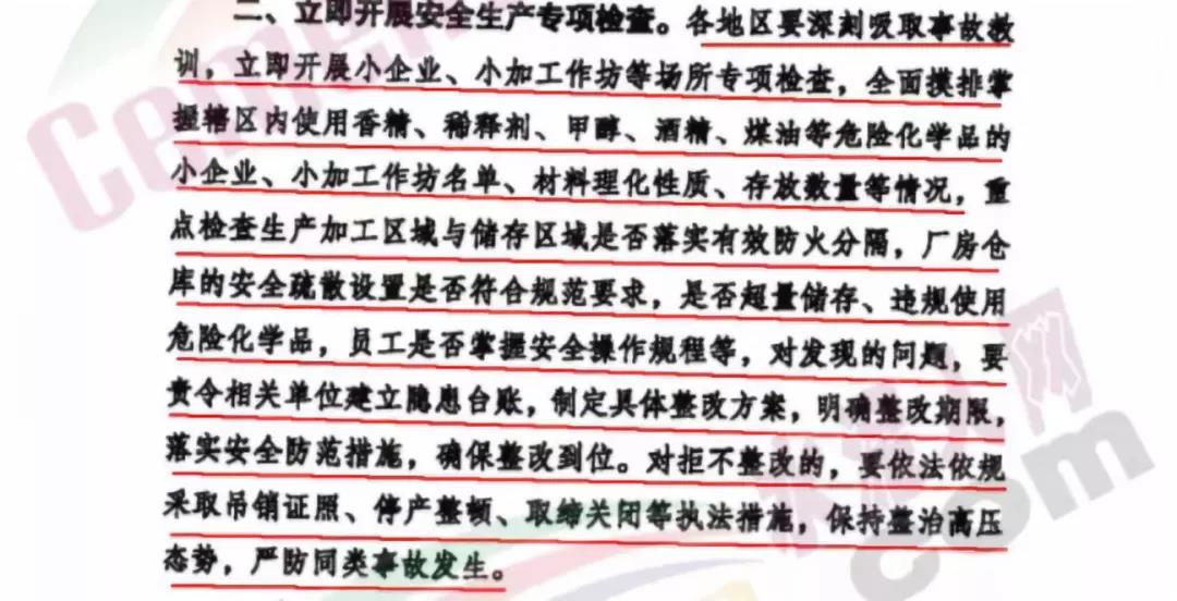 事故發(fā)生后,各級(jí)機(jī)關(guān)非常重視。10月3日,國(guó)務(wù)院安委會(huì)辦公室、應(yīng)急管理部下發(fā)了《關(guān)于浙江寧波銳奇日用品有限公司“9•29”重大火災(zāi)事故的通報(bào)》的特提文件。文件指出,初步調(diào)查表明,火災(zāi)系車間工作人員在一層香水灌裝區(qū)域生產(chǎn)過(guò)程中操作不當(dāng)引發(fā)塑料制品、包裝紙以及三甘酯、異構(gòu)十二烷、香精等原料燃燒。并要求各地立即開(kāi)展小企業(yè)、小加工作坊等場(chǎng)所安全生產(chǎn)專項(xiàng)檢查。