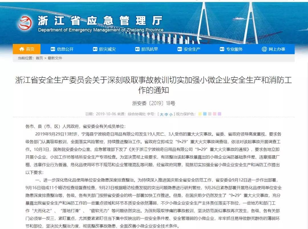 10月6日,浙江省應(yīng)急管理廳發(fā)布了《浙江省安全生產(chǎn)委員會(huì)關(guān)于深刻吸取事故教訓(xùn)切實(shí)加強(qiáng)小微企業(yè)安全生產(chǎn)和消防工作的通知》,稱省政府立即成立了“9•29”重大火災(zāi)事故調(diào)查組,對(duì)該起事故開(kāi)展調(diào)查工作,并要求各級(jí)各部門認(rèn)真吸取教訓(xùn),全面落實(shí)風(fēng)險(xiǎn)管控,持續(xù)推進(jìn)整治工作。