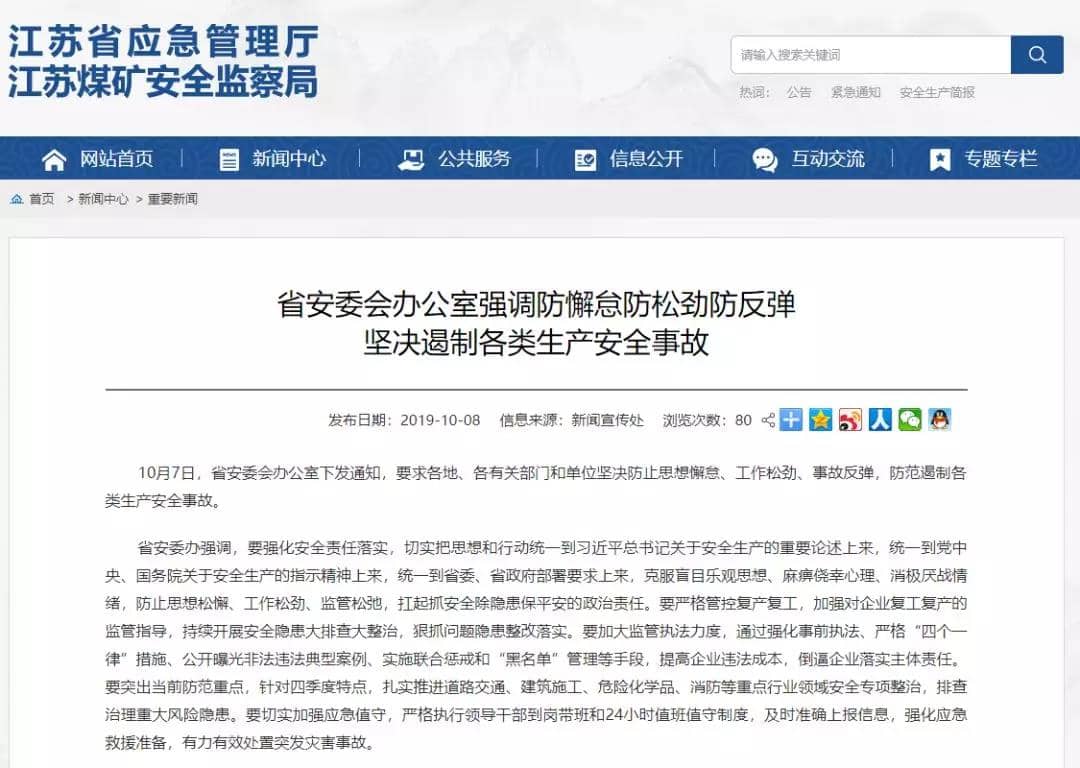 10月7日10月7日,江蘇省安委會(huì)辦公室下發(fā)通知,要求各地、各有關(guān)部門和單位堅(jiān)決防止思想懈怠、工作松勁、事故反彈,防范遏制各類生產(chǎn)安全事故。