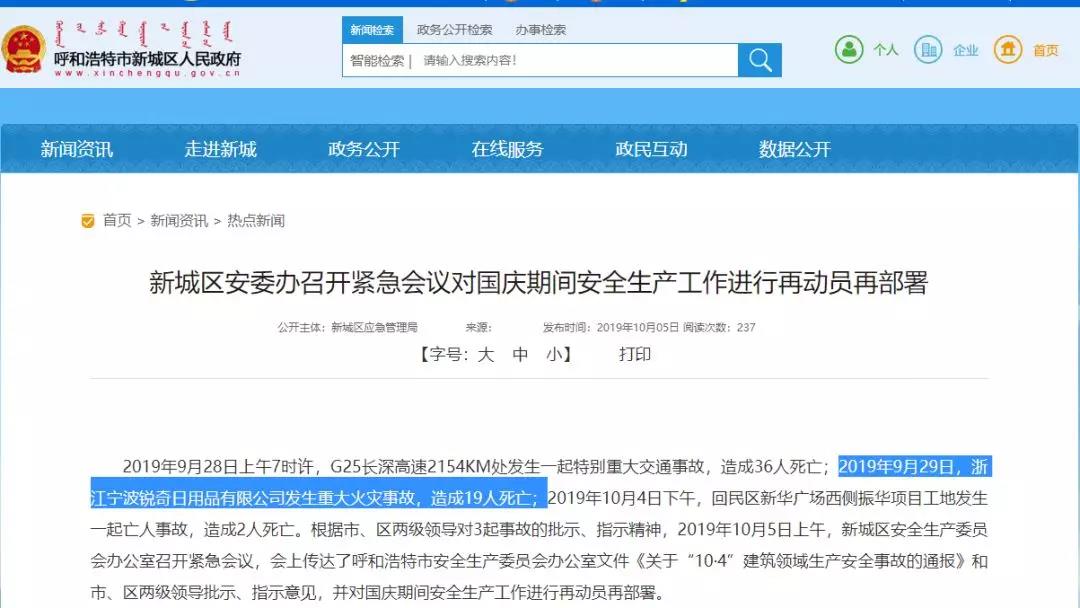 10月5日內(nèi)蒙古呼和浩特市新城區(qū)人民政府轉(zhuǎn)發(fā)新城區(qū)應(yīng)急管理部消息稱,2019年9月28日上午7時(shí)許,G25長(zhǎng)深高速2154KM處發(fā)生一起特別重大交通事故,造成36人死亡;2019年9月29日,浙江寧波銳奇日用品有限公司發(fā)生重大火災(zāi)事故,造成19人死亡;2019年10月4日下午,回民區(qū)新華廣場(chǎng)西側(cè)振華項(xiàng)目工地發(fā)生一起亡人事故,造成2人死亡。根據(jù)市、區(qū)兩級(jí)領(lǐng)導(dǎo)對(duì)3起事故的批示、指示精神,2019年10月5日上午,新城區(qū)安全生產(chǎn)委員會(huì)辦公室召開(kāi)緊急會(huì)議,會(huì)上傳達(dá)了呼和浩特市安全生產(chǎn)委員會(huì)辦公室文件《關(guān)于“10·4”建筑領(lǐng)域生產(chǎn)安全事故的通報(bào)》和市、區(qū)兩級(jí)領(lǐng)導(dǎo)批示、指示意見(jiàn),并對(duì)十一期間安全生產(chǎn)工作進(jìn)行再動(dòng)員再部署。