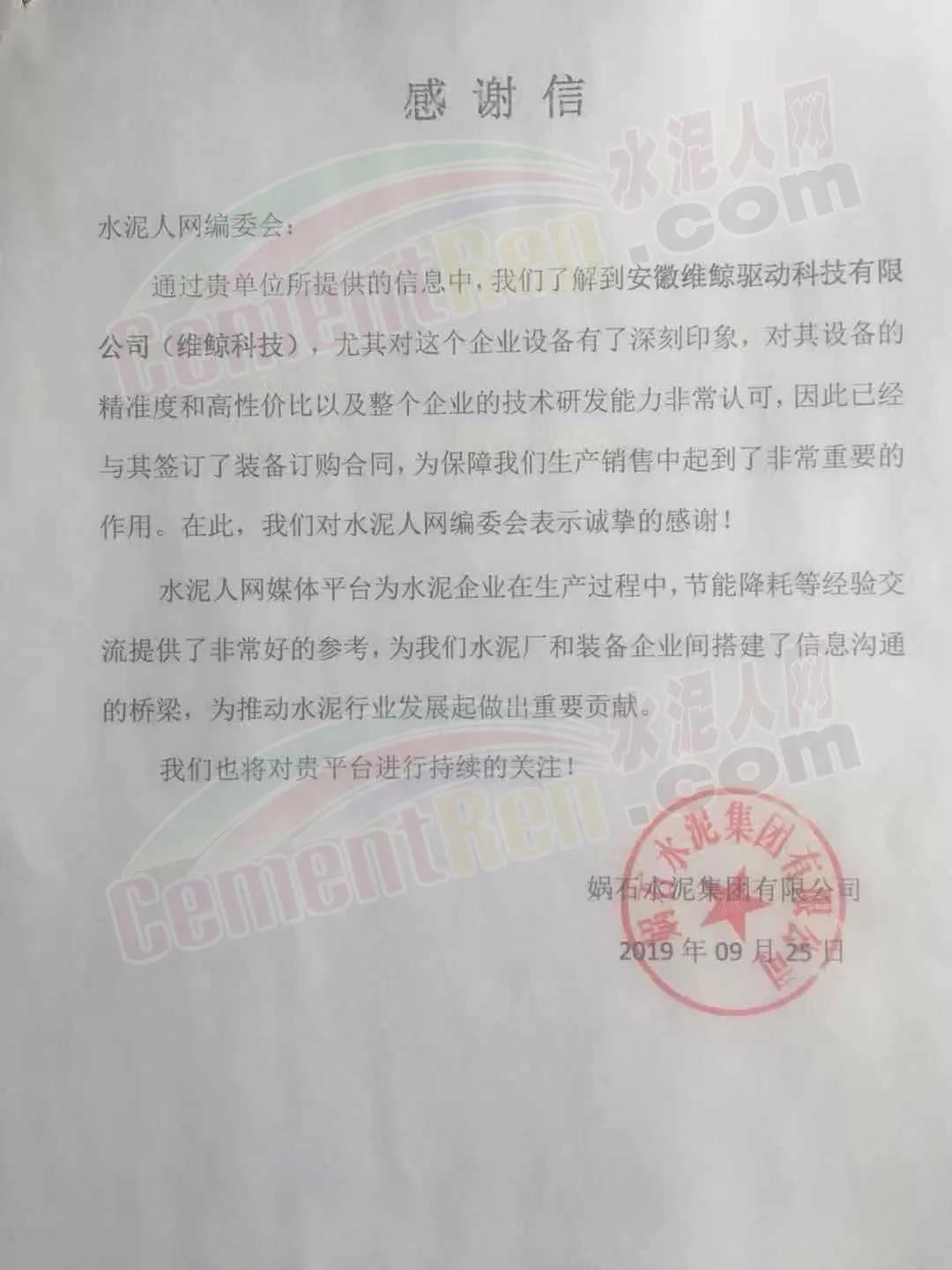 近日,水泥人網(wǎng)收到來自媧石水泥的一封《感謝信》,稱水泥人網(wǎng)為媧石水泥和裝備企業(yè)之間的戰(zhàn)略合作搭建了信息溝通的橋梁。