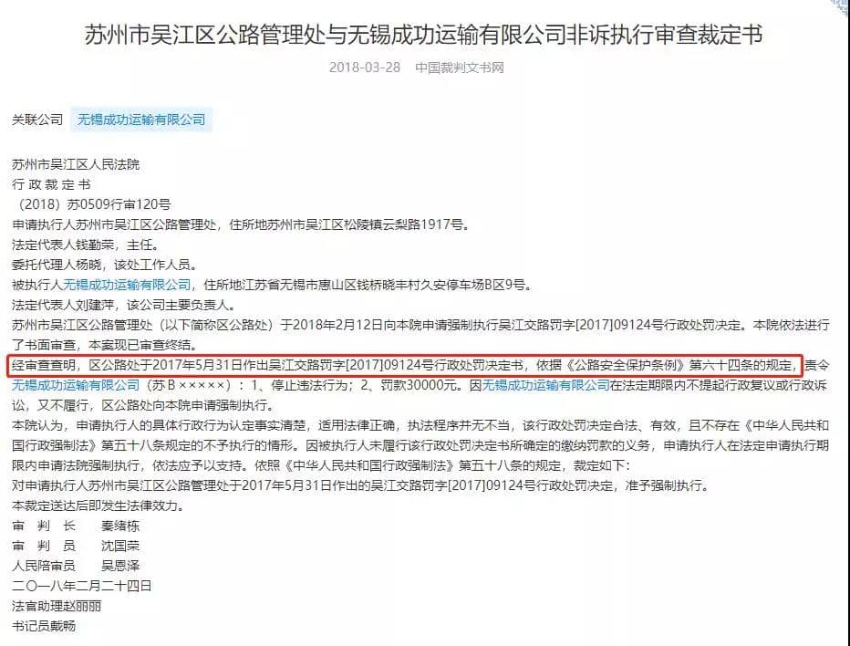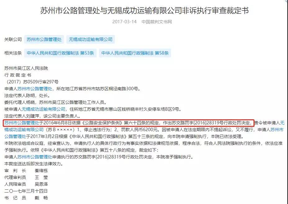 其中,在2016年6月8日至2017年5月31日期間,由于違反《公路安全保護條例》第六十四條,被蘇州市吳江區(qū)公路管理局審查裁定。
