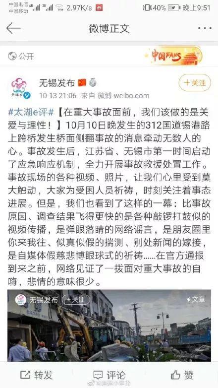 13日晚“無錫發(fā)布”發(fā)布了一篇評論《在重大事故面前,我們該做的是關愛與理性!》,讓輿情再次發(fā)酵。