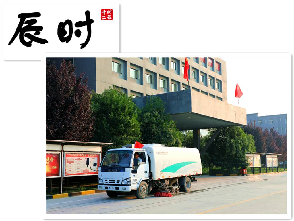 辰時(7:00—9:00)“少刻辰時日正高”。迎著朝陽,灑掃車正奔忙與廠區(qū)之中,為美好的一天營造舒適干凈的環(huán)境。