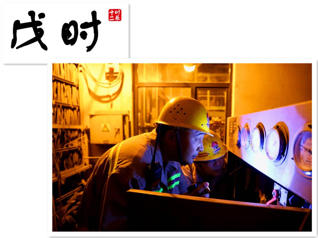戌時(19:00—21:00)“月上柳梢頭,人約黃昏后。”倆名巡檢工正“聚精會神”對煤磨液壓油站進(jìn)行巡檢。