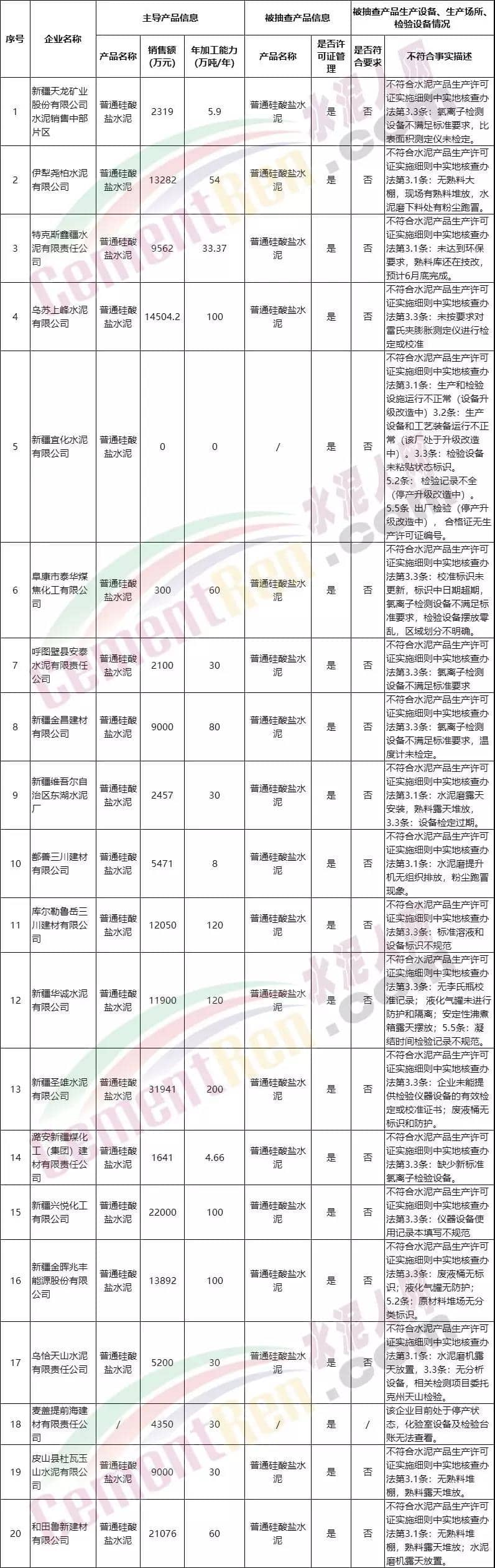 同期對各企業(yè)生產條件進行了監(jiān)督檢查。各地市場監(jiān)督管理部門與新疆維吾爾自治區(qū)產品質量監(jiān)督檢驗研究院共同對涉及工業(yè)產品生產許可證的水泥等生產企業(yè)開展生產條件現(xiàn)場監(jiān)督檢查。檢查結果顯示,大部分企業(yè)證照及資質齊全,生產條件規(guī)范,建立了質量安全相關制度。但仍有部分企業(yè)履行質量安全主體責任淡薄,質量管理體系有待健全和完善。問題主要體現(xiàn)在以下幾個方面:一是部分檢驗設備沒有檢定和校準,或超出檢定校準周期,現(xiàn)場無法提供有效的檢定或校準證書,部分設備沒有進行有效的維護保養(yǎng),檢驗準確性存在安全隱患;二是部分企業(yè)過程控制不嚴、出廠檢驗記錄不全,原輔料驗收記錄、出廠檢驗記錄等不完整,原輔料存放條件不規(guī)范,產品質量安全存在風險;三是部分企業(yè)風險分析制度不完備,缺少產品追溯和召回管理記錄,內部管理有待加強。2019年新疆自治區(qū)水泥生產企業(yè)生產條件檢查結果不符合匯總表