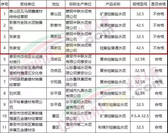 山東泰安4批次樣品不合格,抽樣合格率為63.6%據通報,泰安市市場監(jiān)管局于2019年8月至10月在全市范圍內組織開展了第一批流通領域水泥商品質量監(jiān)督抽查。本次共監(jiān)督抽查10家經營部,抽取11批次樣品。其中檢出4批次樣品不合格,本次水泥商品抽樣合格率為63.6%。4個批次不合格水泥基本情況:2批次礦渣硅酸鹽水泥和2批次普通硅酸鹽水泥;標稱生產單位均為蒙陰中聯(lián)水泥有限公司;標識生產單位地址均為山東省蒙陰縣蒙陰鎮(zhèn)東城村;包裝袋上標注商標均為蒙陰中聯(lián);不合格樣品的不合格項目主要有氯離子、燒失量、3天強度、28天強度等。經營者分別是泰山區(qū)五馬順鑫建材綜合經營部,新泰市老陳水泥銷售處,北集坡鎮(zhèn)張家寶。泰安市2019年度流通領域水泥商品質量第一批專項監(jiān)督抽查結果總匯表