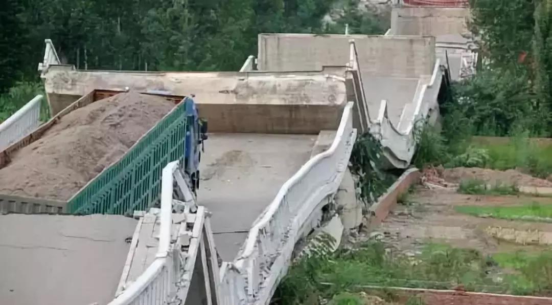 伊河湯營大橋整體垮塌。橋上掛的橫幅是何等諷刺啊?