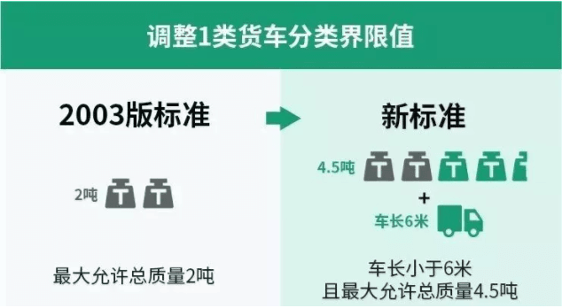 2003老版標(biāo)準(zhǔn)中,貨車按照核定的額定載質(zhì)量進行車型分類,比如準(zhǔn)載2噸及以下為一類車型,準(zhǔn)載2-5噸為二類車型。