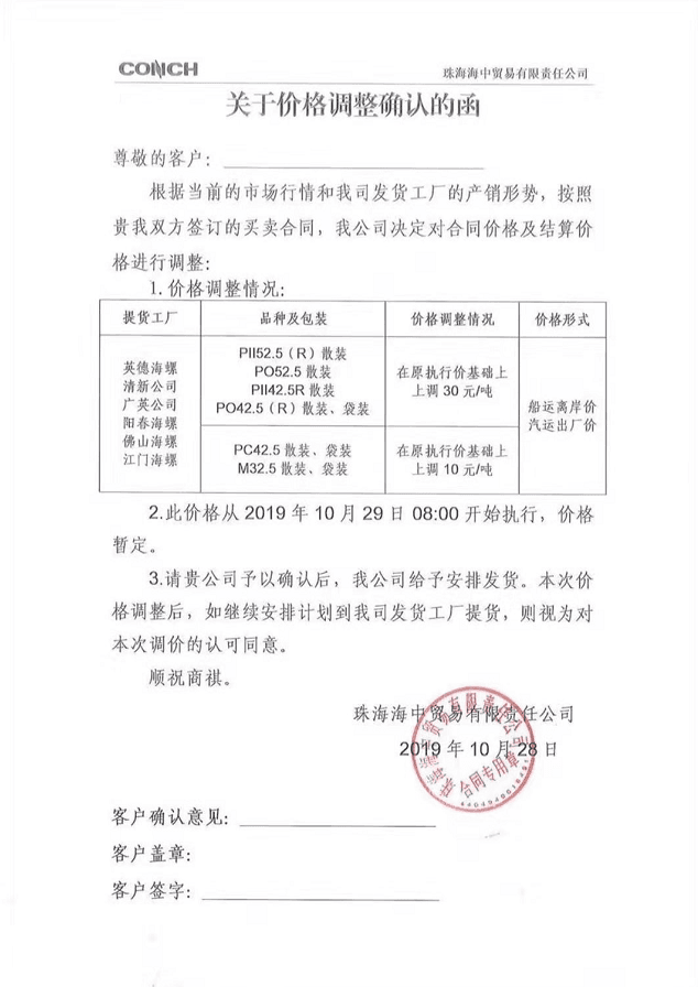 日前,珠海海中貿(mào)易有限責(zé)任公司關(guān)于價格調(diào)整確認(rèn)的函稱:根據(jù)當(dāng)前的市場行情和公司發(fā)貨工廠的產(chǎn)銷形勢,公司決定對合同價格及結(jié)算價格進行調(diào)整,新價格從10月29日8點開始執(zhí)行。
