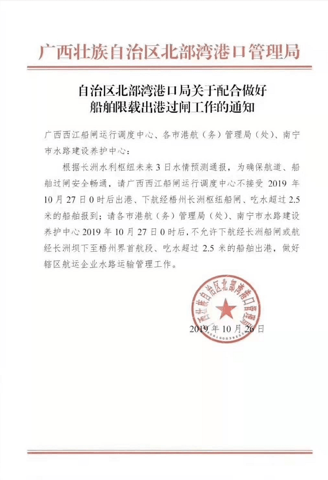 26日廣西壯族自治區(qū)北部灣港口管理局發(fā)布《自治區(qū)北部灣港口局關(guān)于配合做好船舶限載出港過閘工作的通知》稱,根據(jù)長洲水利樞紐未來3日水情預(yù)測通報,為確保航道、船舶過閘安全暢通,請廣告西西江船閘運行調(diào)度中心不接受2019年10月27日0時后出港、下航經(jīng)梧州長洲樞紐船閘、吃水超過2.5米的船舶報道。請各市港航(務(wù))管理局(處)、南寧市水路建設(shè)養(yǎng)護中心2019年10月27日0時后,不允許下航經(jīng)長洲船閘或航經(jīng)長洲壩下至梧州界首航段,吃水超過2.5米的船舶出港,做好轄區(qū)航運企業(yè)水路運輸管理工作。