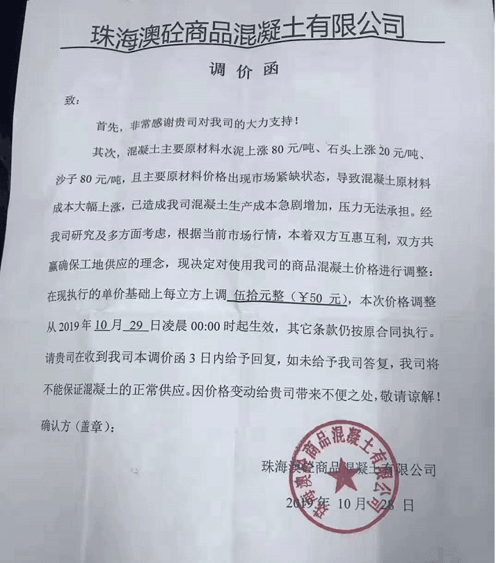 珠海澳砼商品混凝土有限公司調(diào)價函稱,混凝土主要原材料水泥上漲80元/噸、石頭上漲20元/噸、沙子80元/噸,且主要原材料價格出現(xiàn)市場緊缺狀態(tài),導(dǎo)致混凝土原材料成本大幅上漲,已造成公司混凝土生產(chǎn)成本急劇增加,壓力無法承擔(dān)。公司決定對商品混凝土價格進行調(diào)整,在現(xiàn)執(zhí)行單價基礎(chǔ)上上調(diào)50元/立方,本次價格調(diào)整從10月29日凌晨0時起生效。