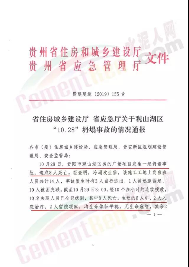 會(huì)議通報(bào),觀山湖區(qū)美的置業(yè)廣場(chǎng)項(xiàng)目在建地下停車場(chǎng)于10月28日16:21許發(fā)生坍塌。倒塌發(fā)生前,該施工工地上崗當(dāng)班人員共計(jì)14人,事故發(fā)生時(shí)3人自行逃出,1人被迅速救起,10人被困失聯(lián)。截至10月29日3:00,經(jīng)10個(gè)多小時(shí)的連續(xù)搜救,10名失聯(lián)人員已全部找到,其中8人死亡。生還6人中,2人入院治療,2人留院觀察,均生命體征平穩(wěn),其余2人經(jīng)檢查身體無(wú)恙已返回住處。
