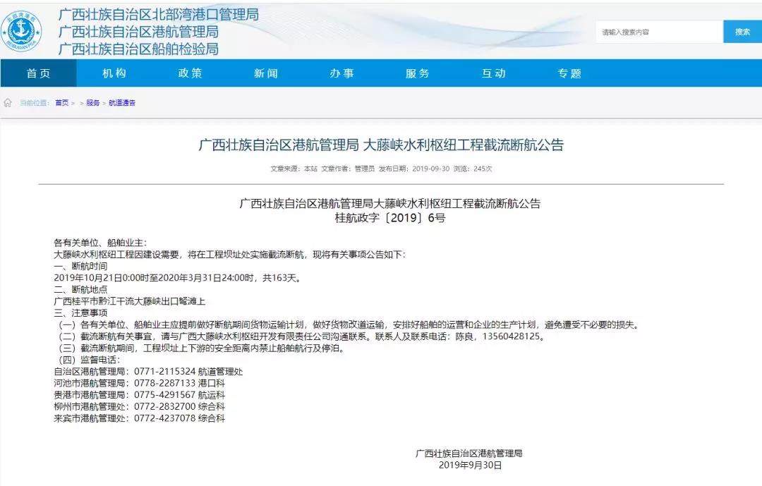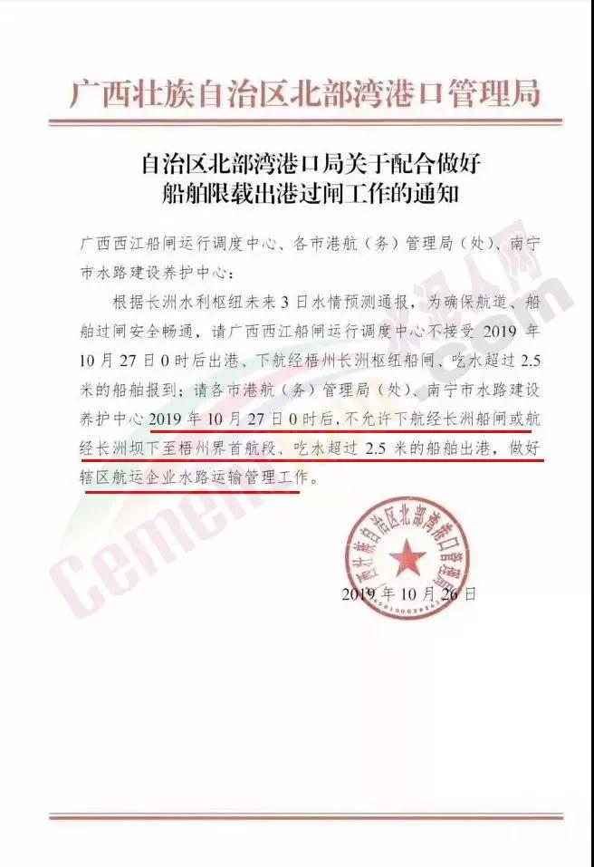 然而,據(jù)水泥人網(wǎng)了解,除了近期發(fā)布的航道清淤工程之外,廣西壯族自治區(qū)港航管理局、梧州市西江黃金水道通航突發(fā)事件應急指揮部、廣西壯族自治區(qū)北部灣港口管理局、交通運輸部長江航務管理局也曾分別發(fā)文,對各區(qū)域內的大壩進行檢修或者進行限流。大藤峽水利樞紐斷航163天!江門、中山等地水泥、砂石價格上漲!廣西壯族自治區(qū)港航管理局發(fā)布《大藤峽水利樞紐工程截流斷航公告》稱:因大藤峽水利樞紐工程建設需要,將于2019年10月21日0:00時至2020年3月31日24:00時(共163天)在廣西桂平市黔江干流大藤峽出口弩灘工程壩址處實施截流斷航。截流斷航期間,工程壩址上下游的安全距離內禁止船舶航行及停泊。斷航公告提示各有關單位、船舶業(yè)主提前做好斷航期間貨物運輸計劃,做好貨物改道運輸,安排好船舶的運營和企業(yè)的生產(chǎn)計劃,避免遭受不必要的損失。