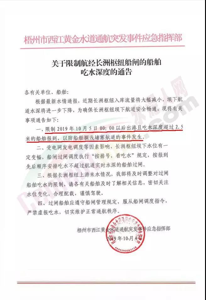 10月26日廣西壯族自治區(qū)北部灣港口管理局發(fā)布《自治區(qū)北部灣港口局關于配合做好船舶限載出港過閘工作的通知》稱,根據(jù)長洲水利樞紐未來3日水情預測通報,為確保航道、船舶過閘安全暢通,請廣告西西江船閘運行調度中心不接受2019年10月27日0時后出港、下航經(jīng)梧州長洲樞紐船閘、吃水超過2.5米的船舶報道。請各市港航(務)管理局(處)、南寧市水路建設養(yǎng)護中心2019年10月27日0時后,不允許下航經(jīng)長洲船閘或航經(jīng)長洲壩下至梧州界首航段,吃水超過2.5米的船舶出港,做好轄區(qū)航運企業(yè)水路運輸管理工作。