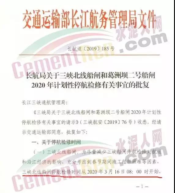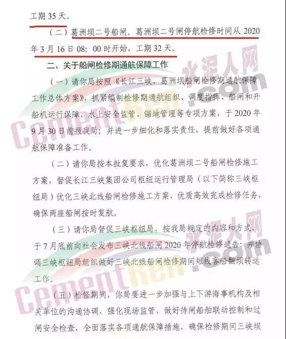 據(jù)水泥人網(wǎng)了解,受航運影響的不僅僅是廣西區(qū)域 ,此前交通運輸部長江航務管理局發(fā)布《長航局關于三峽北線船閘和葛洲壩二號船閘2020年計劃性停航檢修有關事宜的批復》。三峽北線、葛洲壩二號船閘檢修67天!云南、貴州、四川、湖北等地區(qū)水泥運輸受影響!《長航局關于三峽北線船閘和葛洲壩二號船閘2020年計劃性停航檢修有關事宜的批復》稱,三峽北線船閘,為盡量減少三峽船閘停航檢修對航運和沿江經(jīng)濟的影響,充分考慮到春節(jié)期間施工組織困難等因素,三峽北線船閘停航檢修將從2020年3月16日08:00時開始,工期35天,葛洲壩二號船閘。葛洲壩二號閘停航檢修時間從2020年3月16日08:00時開始,工期32天。據(jù)了解,三峽北線船閘和葛洲壩二號船閘的檢修,將會對云南、貴州、四川、湖北、重慶等地長江沿線的水泥運輸造成很大的影響。