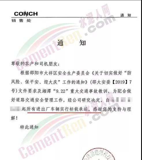 海螺集團旗下邵陽市云峰新能源科技有限公司發(fā)布通知稱,為配合邵陽市大祥區(qū)安委會文件要求及湘潭"9.22"重大交通事故教訓,為配合做好道路交通安全管理工作,經公司研究決定,即日起所有進出廠車輛實行標載承運。