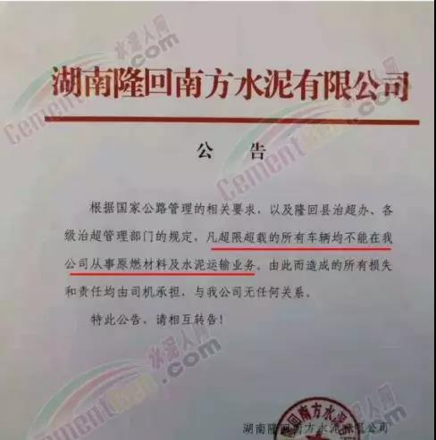 湖南隆回南方水泥有限公司也發(fā)布公告,根據國家公路管理的相關要求,以及隆回縣治超辦、各級治超管理部門的規(guī)定,凡超限超載的所有車輛均不能在其公司從事原燃材料及水泥運輸業(yè)務 。
