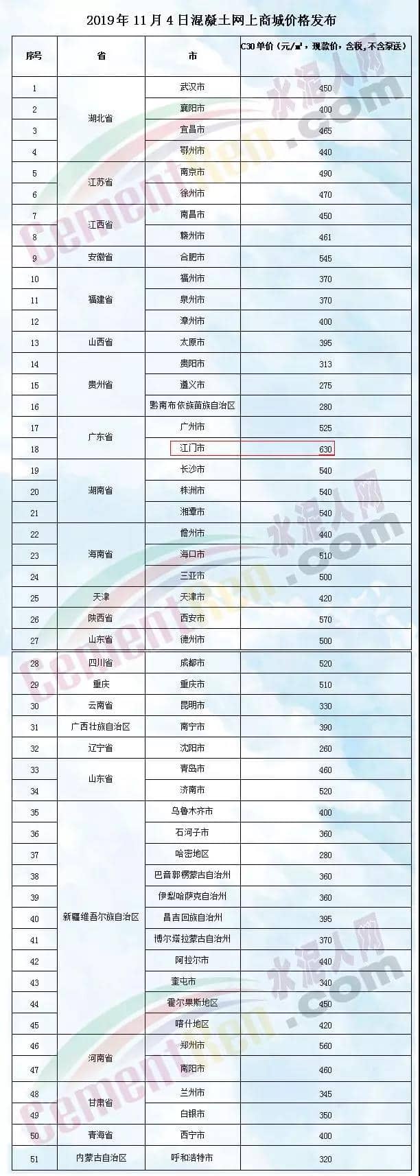 據了解,在生產水泥的過程中礦粉可以替代部分熟料,以減少熟料的摻加量。熟料價格相對較高的區(qū)域,企業(yè)多以礦粉替代部分熟料。南方區(qū)域鋼鐵廠相對較少,熟料價格卻相對較高,礦粉需求量大 ,部分企業(yè)跨區(qū)域從北方地區(qū)采購水渣,以致于成本上漲,產品售價隨著上漲。據水泥人網了解,近期華中南地區(qū)不僅礦粉價格居高不下,其他混合材產品隨著水泥需求量上漲而上調出廠價格?;炷羶r格大漲,廣東地區(qū)C30混凝土直奔700元/方11月4日,混凝土行業(yè)最大上市公司——中建西部建設在自己的電商平臺發(fā)布了最新的混凝土報價。廣東、陜西、河南、安徽、山東、四川、重慶、海南等地區(qū)的C30商混價格已經突破500元/m³,其中廣東江門地區(qū)已突破630元/m³。并且在報價說明中指出該價格均為現款價,不含稅、不含泵送,還需先付款。