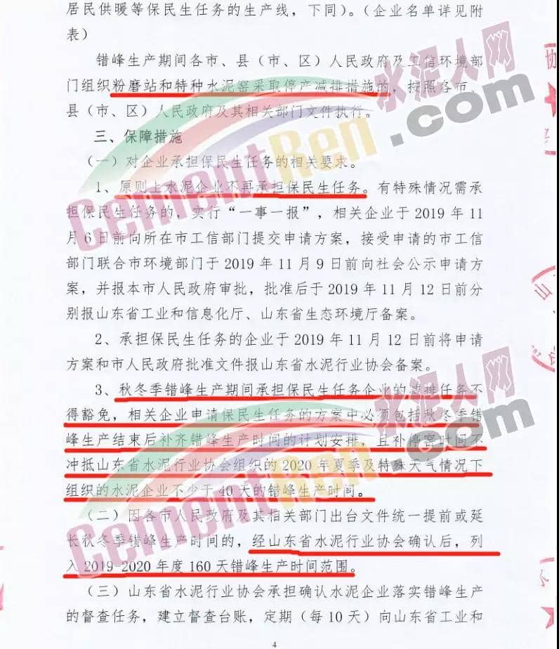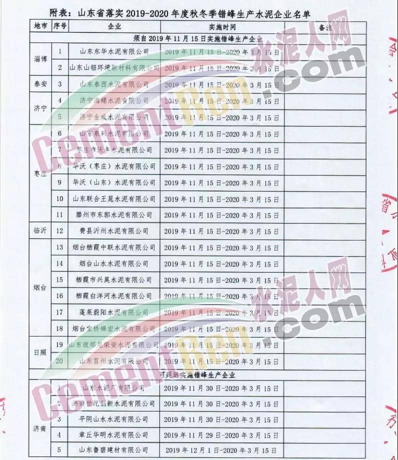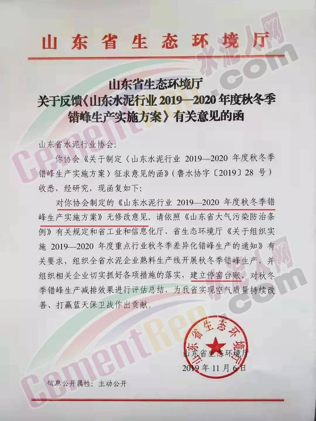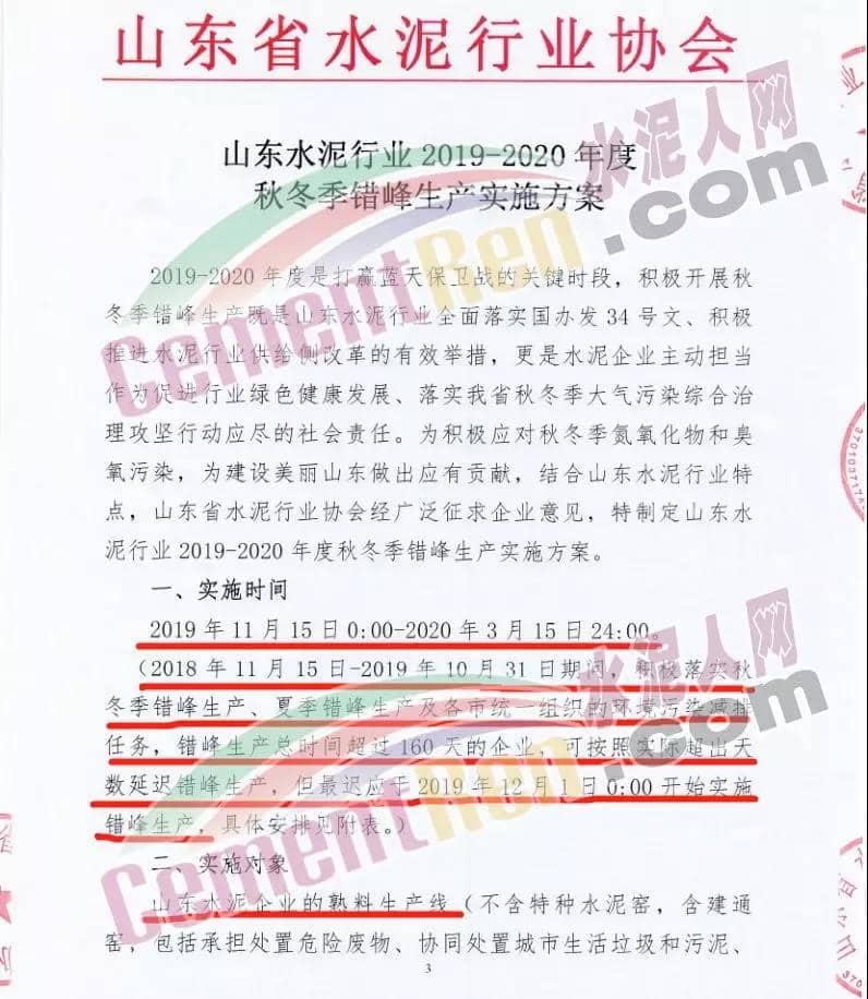 一、實施時間: 2019年11月15日0時-2020年3月15日24時。(2018年11月15日-2019年10月31日期間,積極落實秋冬季錯峰生產、夏季錯峰生及各市統一組織的環(huán)境污染減排任務,錯峰生產總時間超過160天的企業(yè),可按照實際超出天數延遲錯峰生產,但最遲應于2019年12月1日0時開始實施錯峰生產,具體安排見附表。)二、實施對象: 山東水泥企業(yè)的熟料生產線(不含特種水泥窯,含建通窯,包括承擔處置危險廢物、協同處置城市生活垃圾和污泥、居民供暖等保民生任務的生產線,下同)。(企業(yè)名單見附表); 錯峰生產期間各市、縣(市、區(qū))人民政府及工信環(huán)境部門組織粉磨站和特種水泥窯采取停產減排措施的,按照各市、縣(市、區(qū))人民政府及相關部門文件執(zhí)行。三、保障措施 1、原則上水泥企業(yè)不再承擔保民生任務。有特殊情況需承擔民生任務的,實行“一事一報”,相關企業(yè)于2019年11月6日前向所在市工信部門提交申請方案,接受申請的市工信部門聯合市環(huán)境部門于2019年11月9日前向社會公示申請方案,并報本市人民政府審批,批準后于2019年11月12日前分別報山東省工業(yè)和信息化廳、山東省生態(tài)環(huán)境廳備案?! ?、承擔保民生任務的企業(yè)于2019年11月12日前將申請方案和市人民政府批準文件報山東省水泥行業(yè)協會備案?! ?、秋冬季錯峰生產期間承擔保民生任務企業(yè)的減排任務不得豁免,相關企業(yè)申請保民生任務的方案中必須包括秋冬季錯峰生產結束后補齊錯峰生產時間的計劃安排,且補停窯時間不沖抵山東省水泥行業(yè)協會組織的2020年夏季及特殊天氣情況下組織的水泥企業(yè)不少于40天的錯峰生產時間。全文如下: