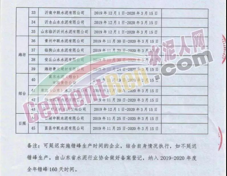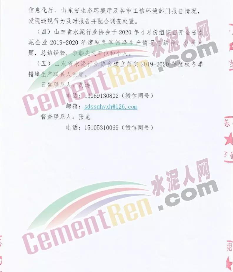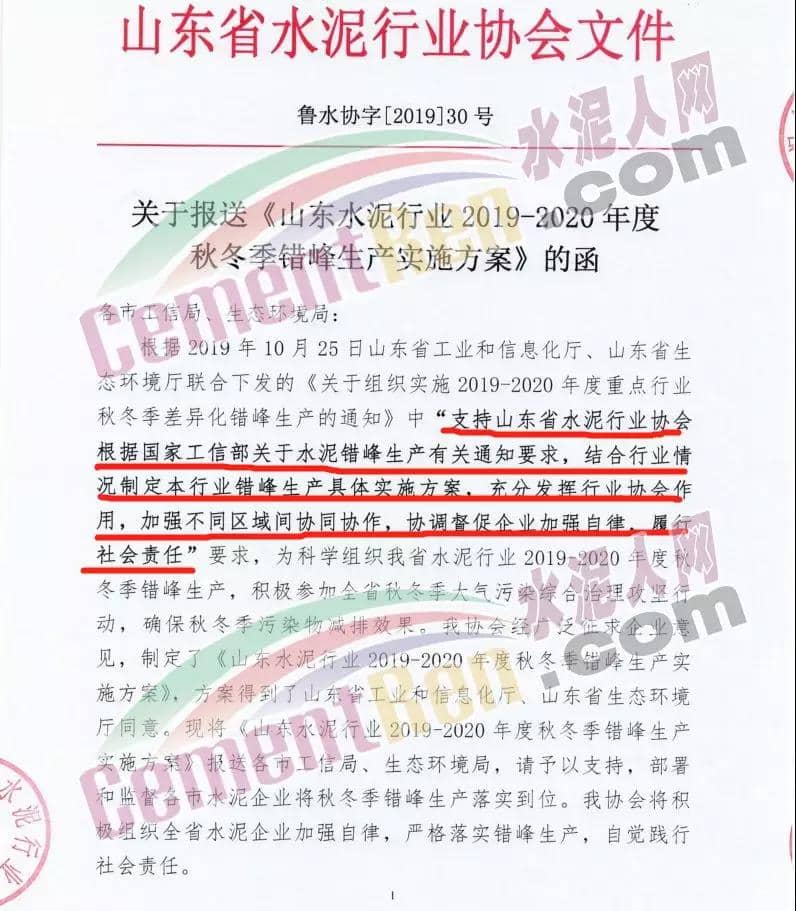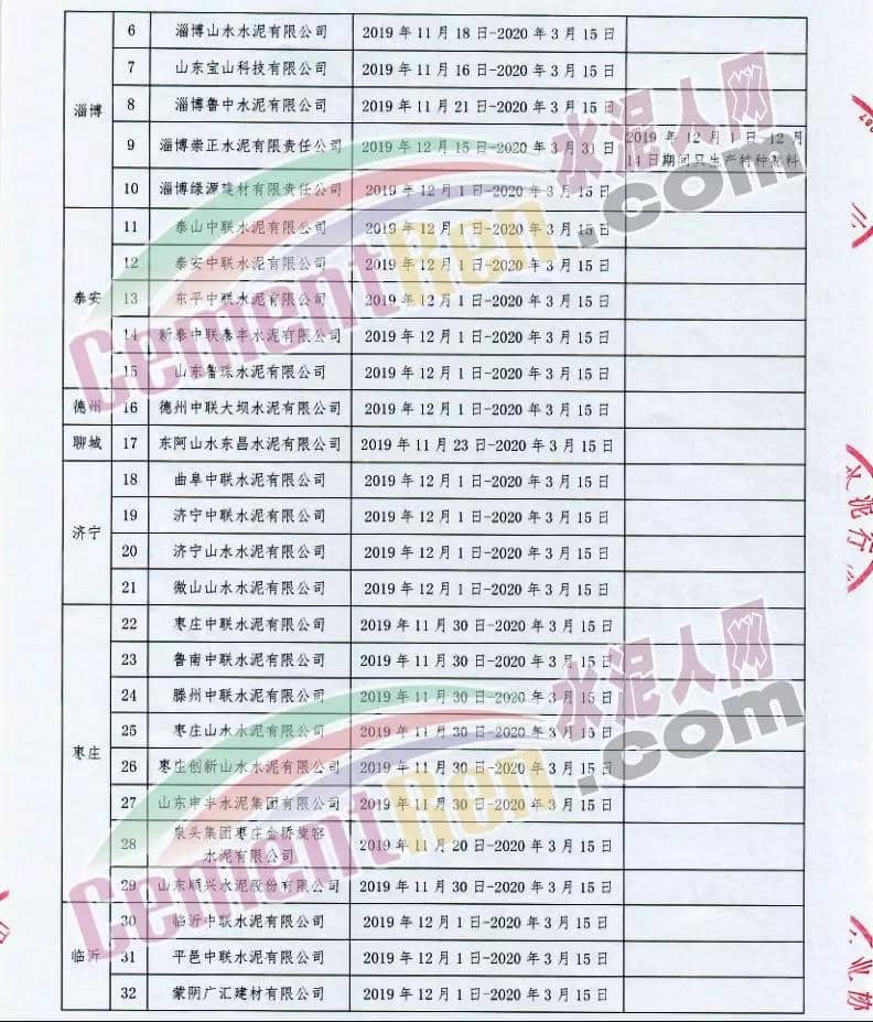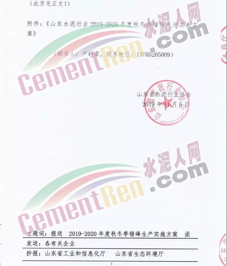 一、實施時間: 2019年11月15日0時-2020年3月15日24時。(2018年11月15日-2019年10月31日期間,積極落實秋冬季錯峰生產、夏季錯峰生及各市統一組織的環(huán)境污染減排任務,錯峰生產總時間超過160天的企業(yè),可按照實際超出天數延遲錯峰生產,但最遲應于2019年12月1日0時開始實施錯峰生產,具體安排見附表。)二、實施對象: 山東水泥企業(yè)的熟料生產線(不含特種水泥窯,含建通窯,包括承擔處置危險廢物、協同處置城市生活垃圾和污泥、居民供暖等保民生任務的生產線,下同)。(企業(yè)名單見附表); 錯峰生產期間各市、縣(市、區(qū))人民政府及工信環(huán)境部門組織粉磨站和特種水泥窯采取停產減排措施的,按照各市、縣(市、區(qū))人民政府及相關部門文件執(zhí)行。三、保障措施 1、原則上水泥企業(yè)不再承擔保民生任務。有特殊情況需承擔民生任務的,實行“一事一報”,相關企業(yè)于2019年11月6日前向所在市工信部門提交申請方案,接受申請的市工信部門聯合市環(huán)境部門于2019年11月9日前向社會公示申請方案,并報本市人民政府審批,批準后于2019年11月12日前分別報山東省工業(yè)和信息化廳、山東省生態(tài)環(huán)境廳備案?! ?、承擔保民生任務的企業(yè)于2019年11月12日前將申請方案和市人民政府批準文件報山東省水泥行業(yè)協會備案?! ?、秋冬季錯峰生產期間承擔保民生任務企業(yè)的減排任務不得豁免,相關企業(yè)申請保民生任務的方案中必須包括秋冬季錯峰生產結束后補齊錯峰生產時間的計劃安排,且補停窯時間不沖抵山東省水泥行業(yè)協會組織的2020年夏季及特殊天氣情況下組織的水泥企業(yè)不少于40天的錯峰生產時間。全文如下: