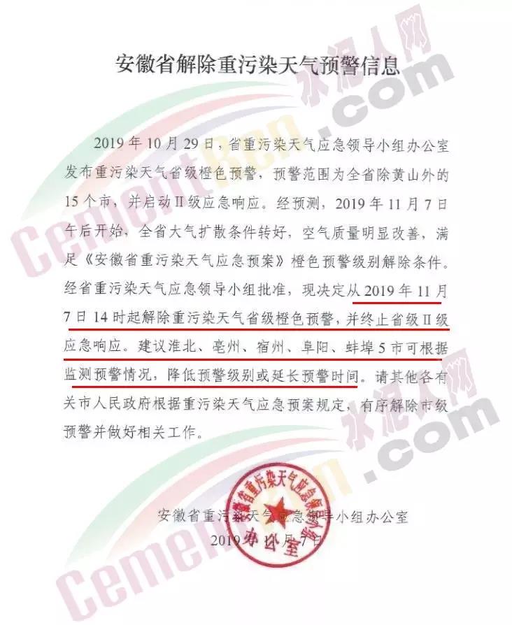 經(jīng)省重污染天氣應(yīng)急領(lǐng)導(dǎo)小組批準(zhǔn),決定從2019年11月7日14時起解除重污染天氣省級橙色預(yù)警,并終止省級Ⅱ級應(yīng)急響應(yīng)。建議淮北、亳州、宿州、阜陽、蚌埠5市可根據(jù)監(jiān)測預(yù)警情況,降低預(yù)警級別或延長預(yù)警時間。原文如下: