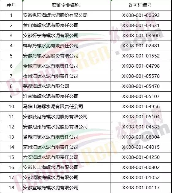 安徽省內(nèi)18家海螺水泥企業(yè)名單