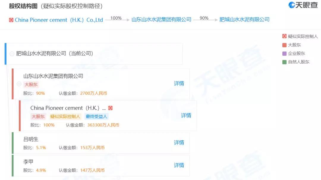 上述名單中2019年8月被列入的肥城山水水泥有限公司(生產(chǎn)許可證編號(hào):XK08-001-05972),生產(chǎn)地址位于 山東省泰安市肥城市安站鎮(zhèn)站北村東。企業(yè)擁有1條粉磨生產(chǎn)線,關(guān)鍵設(shè)備為φ3.8×13m水泥磨機(jī)1臺(tái)。天眼查數(shù)據(jù)顯示,肥城山水水泥有限公司為山東山水水泥集團(tuán)有限公司旗下控股子公司。股東結(jié)構(gòu)圖如下: