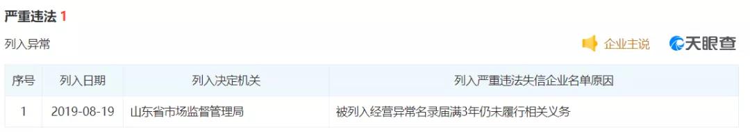 天眼查數(shù)據(jù)顯示一項(xiàng)嚴(yán)重違法,被列入嚴(yán)重違法失信企業(yè)名單原因?yàn)楫惓C泴脻M3年未履行相關(guān)義務(wù)。