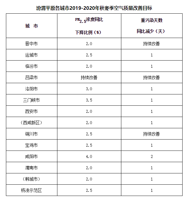 附件:1.汾渭平原各城市2019-2020年秋冬季空氣質(zhì)量改善目標(biāo)