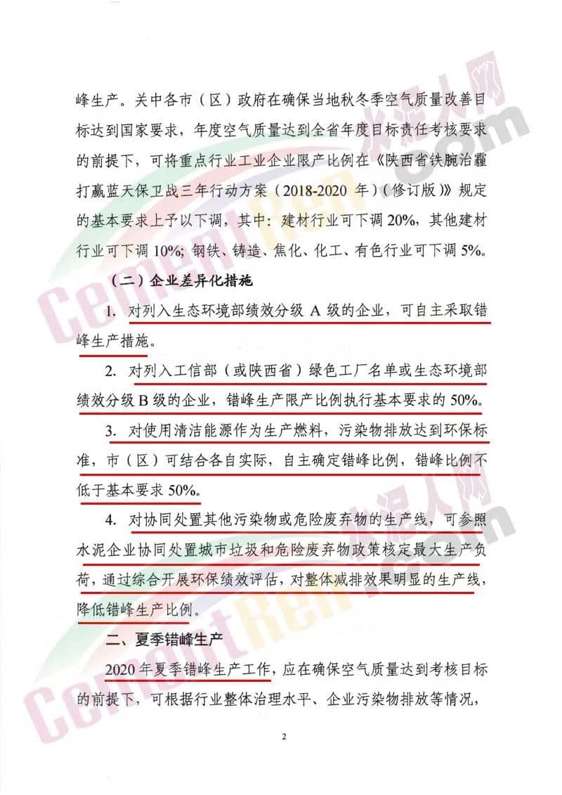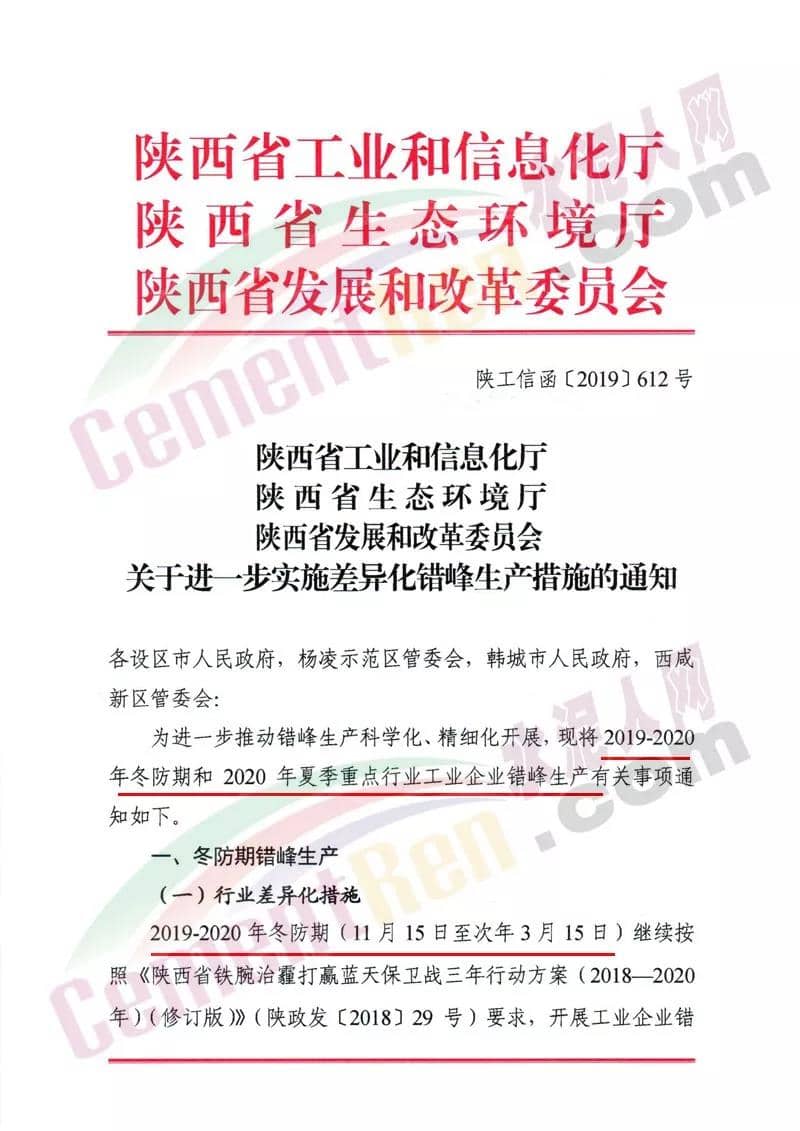 (一)對(duì)滿足環(huán)保排放要求且污染物排放總量小、對(duì)穩(wěn)增長、穩(wěn)就業(yè)、穩(wěn)外貿(mào)等影響大的生產(chǎn)工序,可適度減少錯(cuò)峰。 (二)對(duì)承擔(dān)供氣、供熱等民生任務(wù)的保障類企業(yè),可根據(jù)供氣、供熱需求優(yōu)化錯(cuò)峰生產(chǎn)比例?! ?三)完成治理任務(wù)且列入工業(yè)和信息化部綠色工廠示范的企業(yè)、污染物排放達(dá)到超低排放標(biāo)準(zhǔn)(沒有超低排放標(biāo)準(zhǔn)的行業(yè),污染物排放低于行業(yè)特別排放限值20%以上)且物料運(yùn)輸采用鐵路運(yùn)輸或其他清潔運(yùn)輸方式的企業(yè)(其中,焦化企業(yè)必須采取干法熄焦)、滿足生態(tài)環(huán)境部《關(guān)于加強(qiáng)重污染天氣應(yīng)對(duì)夯實(shí)應(yīng)急減排措施的指導(dǎo)意見》要求的A級(jí)企業(yè),可列入豁免清單,不參與錯(cuò)峰?! ?四)對(duì)產(chǎn)業(yè)結(jié)構(gòu)指導(dǎo)目錄中限制類和環(huán)??冃Р畹囊岣咤e(cuò)峰限產(chǎn)比例或?qū)嵤┩.a(chǎn)?! ?五)錯(cuò)峰生產(chǎn)要與重污染天氣應(yīng)急減排措施相銜接,保證重污染天氣應(yīng)急減排需要,對(duì)于重污染天氣應(yīng)急預(yù)警不可臨時(shí)中斷的生產(chǎn)線或生產(chǎn)工序,減排量可通過提前采取錯(cuò)峰生產(chǎn)措施予以落實(shí)。各市要根據(jù)以上規(guī)定和錯(cuò)峰生產(chǎn)重點(diǎn)領(lǐng)域進(jìn)一步完善落實(shí)錯(cuò)峰生產(chǎn)方案。 據(jù)水泥人網(wǎng)了解,山西區(qū)域多個(gè)城市此前都發(fā)布了錯(cuò)峰生產(chǎn)計(jì)劃,要求轄區(qū)內(nèi)水泥企業(yè)從 2019年10月1日00時(shí)至2020年3月31日24時(shí)實(shí)施錯(cuò)峰生產(chǎn)。水泥企業(yè)完成無組織治理和特別排放限值改造的限產(chǎn)50%,未完成的停產(chǎn)整治。附山西、陜西區(qū)域水泥熟料生企業(yè)名單: