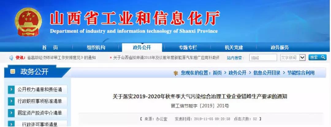 同屬汾渭平原,近日山西省工業(yè)和信息化廳山西省生態(tài)環(huán)境廳也發(fā)布了關(guān)于《關(guān)于落實(shí)2019-2020年秋冬季大氣污染綜合治理工業(yè)企業(yè)錯(cuò)峰生產(chǎn)要求的通知》