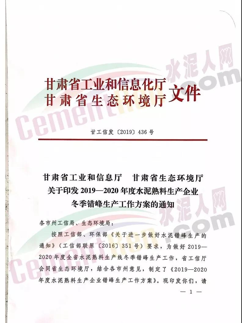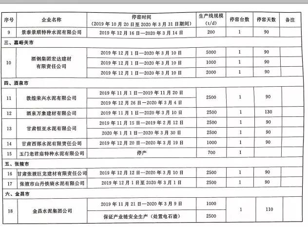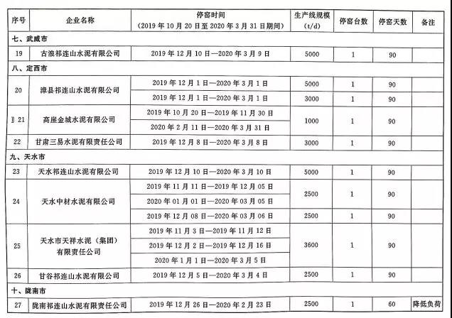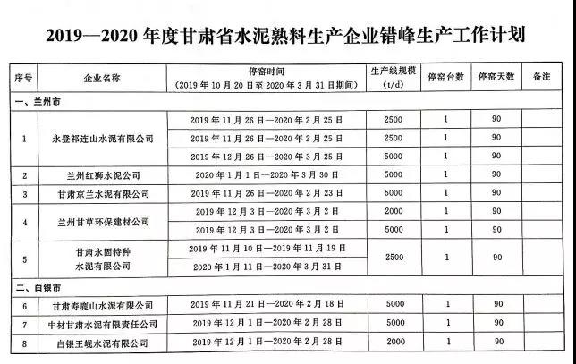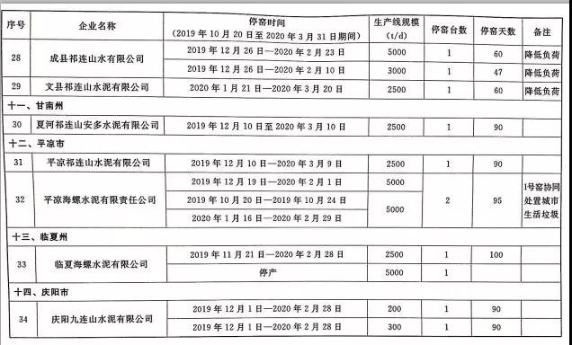 2019~2020年度甘肅省水泥熟料生產(chǎn)企業(yè)錯(cuò)峰生產(chǎn)工作計(jì)劃,其中涉及34家水泥企業(yè),名單如下: