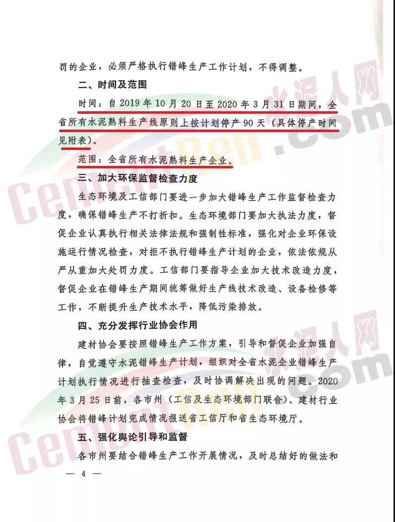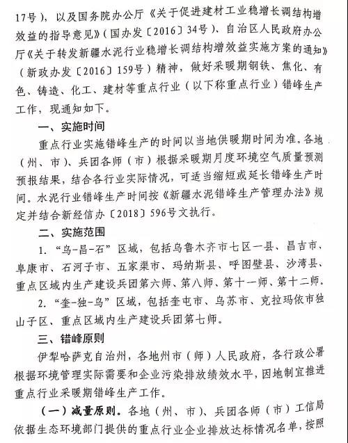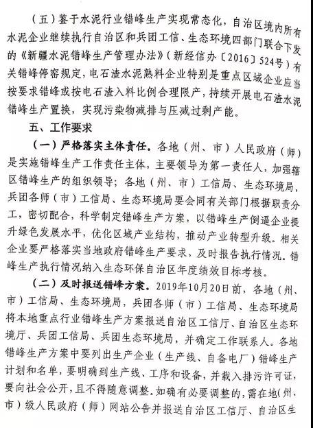 根據(jù)新疆建材行業(yè)協(xié)會(huì)發(fā)布的關(guān)于2019-2020年水泥行業(yè)錯(cuò)峰生產(chǎn)的通知要求,全疆所有水泥生產(chǎn)企業(yè)(含兵團(tuán))按文件要求執(zhí)行錯(cuò)峰停窯。除和田地區(qū)從2019年12月1日零時(shí)起,其他各地州(市)從2019年11月1日零時(shí)起執(zhí)行冬季采暖期錯(cuò)峰生產(chǎn),停窯時(shí)間少于采暖期時(shí)間應(yīng)予順延或補(bǔ)齊,2019-2020年具體錯(cuò)峰停容時(shí)間各地有所差異,其他應(yīng)對(duì)重污染天氣時(shí)要按應(yīng)急響應(yīng)機(jī)制要求停窯。結(jié)合各地冬季采暖季、春季揚(yáng)沙天氣等減排環(huán)保要求,以及當(dāng)?shù)厮喈a(chǎn)能過(guò)剩、電石渣水泥不同生產(chǎn)等實(shí)際情況,依據(jù)《關(guān)于2018-2019年冬季水泥錯(cuò)峰生產(chǎn)的通知》(新韁)錯(cuò)峰停窯時(shí)間。