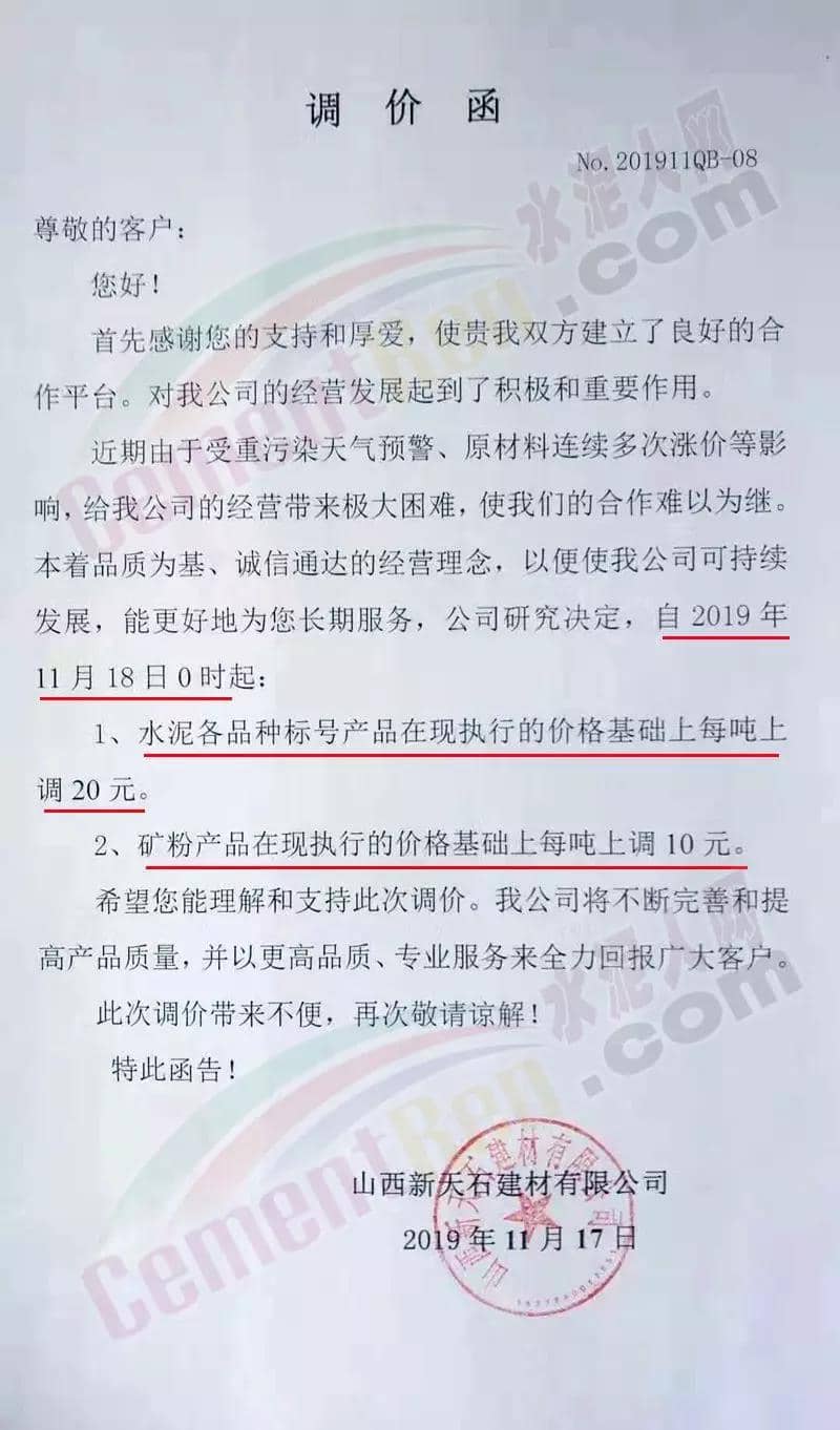 同一天,山西新天石建材有限公司發(fā)調(diào)價函稱,近期由于受重污染天氣預(yù)警、原材料連續(xù)多次漲價等影響,給公司的經(jīng)營帶來極大困難。經(jīng)公司研究決定自今日(11月18日)0時起:水泥各品種標(biāo)號產(chǎn)品在現(xiàn)執(zhí)行的價格基礎(chǔ)上每噸上調(diào)20元;礦粉產(chǎn)品在現(xiàn)執(zhí)行價格基礎(chǔ)上每噸上調(diào)10元。