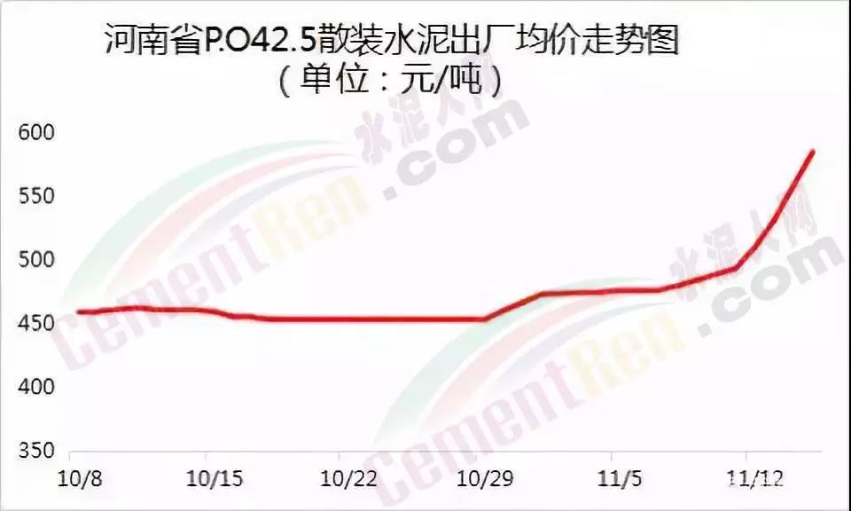 圖1:河南省P.O42.5散裝水泥出廠均價走勢圖從圖中可以看出,10月末至今河南省P.O42.5散裝水泥出廠均價漲幅超過100元/噸。近期,除少部分地區(qū)上調(diào)30-60元/噸外,多數(shù)區(qū)域水泥價格漲幅100元/噸以上。