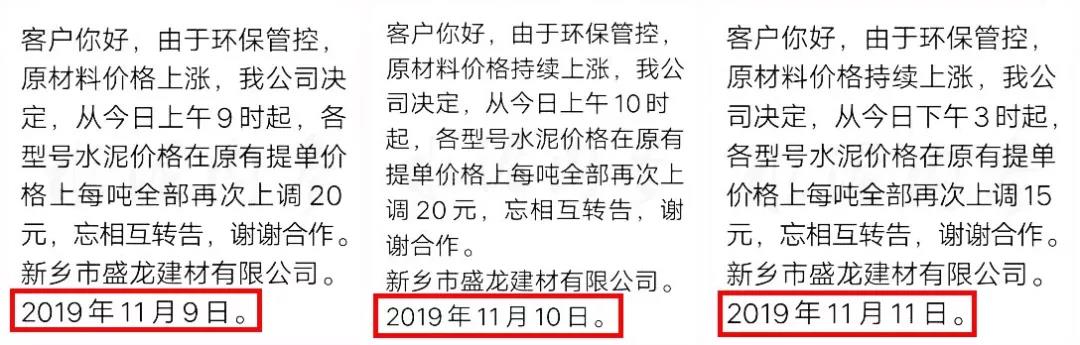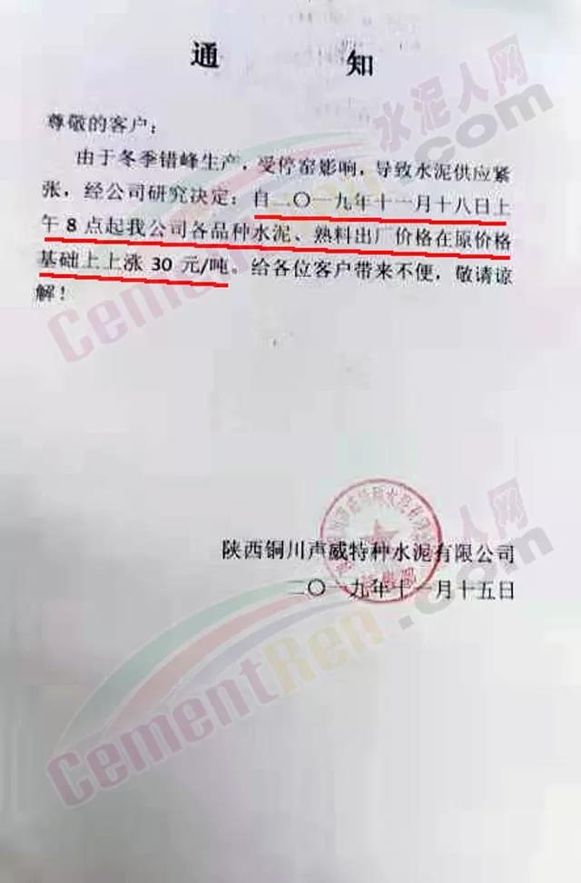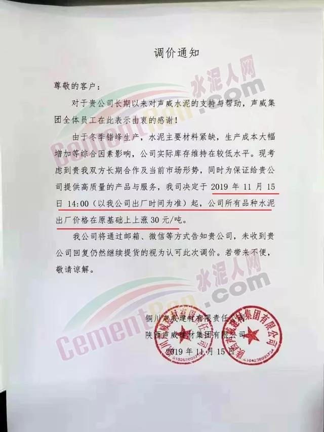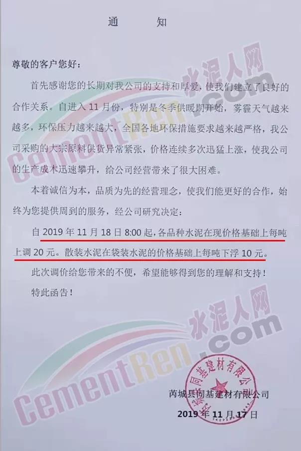據(jù)水泥人網(wǎng)了解,山西區(qū)域繼區(qū)域主導(dǎo)企業(yè)聞喜冀東、威頓水泥等上調(diào)水泥價(jià)格后,區(qū)域內(nèi)其他企業(yè)陸續(xù)跟漲。山西省運(yùn)城市芮城縣同基建材有限公司調(diào)價(jià)通知稱,自進(jìn)入11月份,特別是冬季供暖期開始,霧霾天氣越來越多,環(huán)保壓力越來越大,全國(guó)各地環(huán)保措施要求越來越嚴(yán)格。公司采購(gòu)的大宗原料供貨異常緊張,價(jià)格連續(xù)多次迅猛上漲,使公司生產(chǎn)成本迅速攀升,給公司經(jīng)營(yíng)帶來很大困難。經(jīng)公司研究決定 ,自11月18日8時(shí)起,各品種水泥在現(xiàn)價(jià)格基礎(chǔ)上每噸上調(diào)20元。