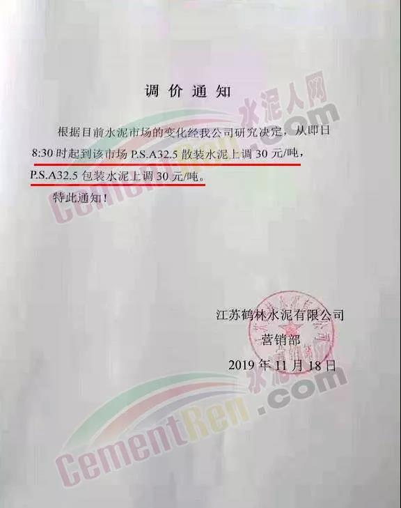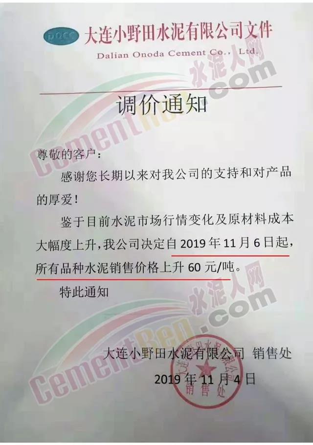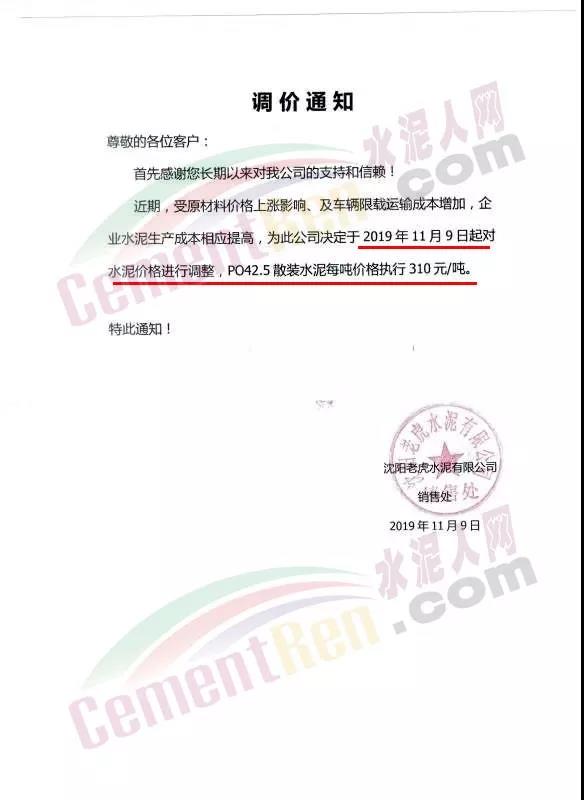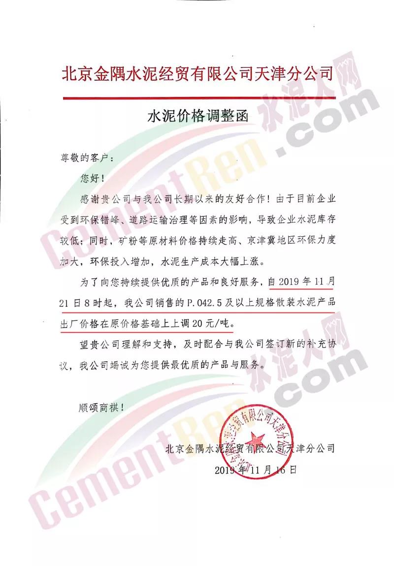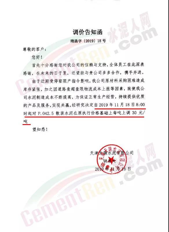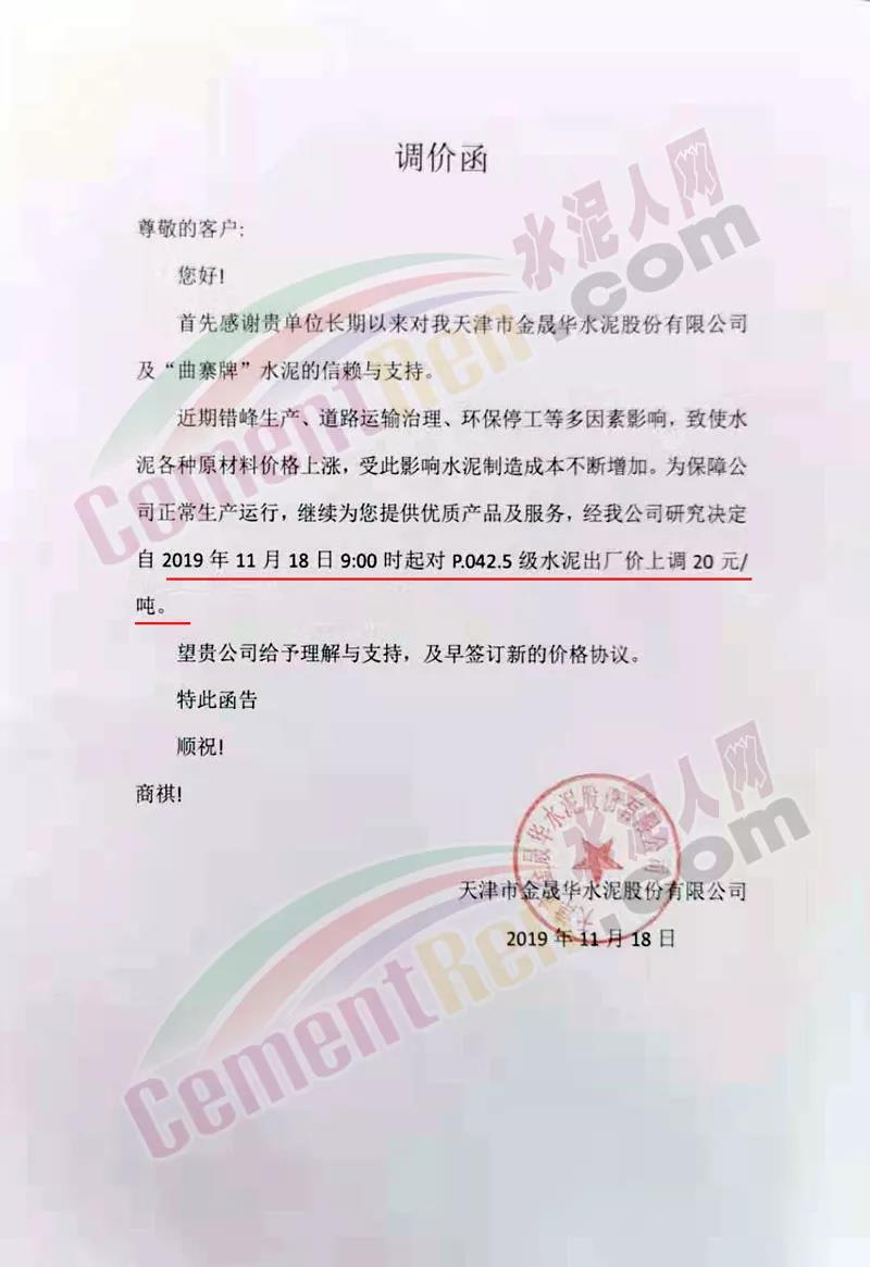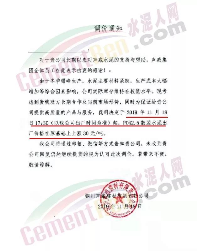 天津市金晟華水泥股份有限公司調(diào)價(jià)通知稱,近期錯(cuò)峰生產(chǎn),道路運(yùn)輸治理、環(huán)保停工等多因素影響,致使水泥各種原材料價(jià)格上漲,受此影響水泥制造成本不斷增加,為保障公司正常生產(chǎn)運(yùn)行,經(jīng)公司研究決定自11月18日9時(shí)起對(duì)PO42.5級(jí)水泥出廠價(jià)上調(diào)20元/噸。