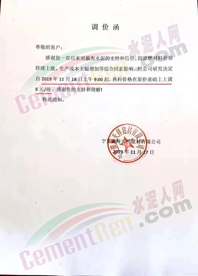 天津天旺崇正水泥有限責(zé)任公司關(guān)于水泥銷售主價(jià)格調(diào)整的告知函稱,針對(duì)大氣污染治理,相關(guān)熟料企業(yè)錯(cuò)峰停產(chǎn)、限產(chǎn)等原因?qū)е略暇o缺且價(jià)格上調(diào)幅度較大,運(yùn)輸限超運(yùn)價(jià)上調(diào),造成我公司水泥生產(chǎn)成本大幅度上漲。公司決定自11月18日8時(shí)起各品種水泥出廠價(jià)在原價(jià)格基礎(chǔ)上每噸上調(diào)20元。