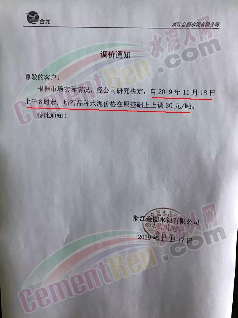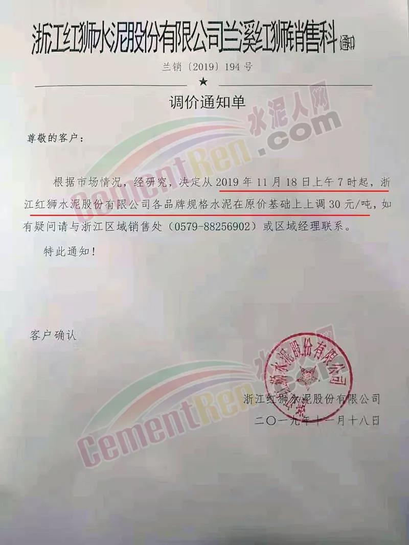 18日浙江省區(qū)域主導(dǎo)企業(yè)紅獅水泥、金圓水泥也發(fā)布了調(diào)價(jià)通知,自11月18日上午7時(shí)起,水泥在原價(jià)基礎(chǔ)上上調(diào)30元/噸。