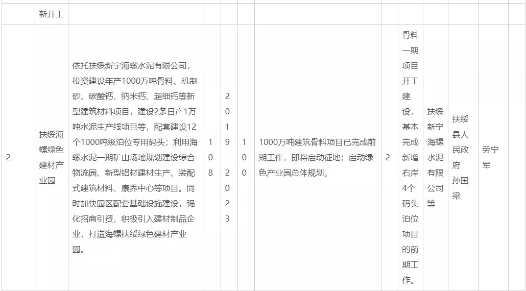 西崇左市人民政府辦公室發(fā)布《關(guān)于印發(fā)崇左市“雙十雙新”產(chǎn)業(yè)項(xiàng)目推進(jìn)工作方案的通知》,公布了全市“雙十雙新”產(chǎn)業(yè)項(xiàng)目清單,其中扶綏海螺綠色建材產(chǎn)業(yè)園項(xiàng)目在列,總投資高達(dá)108億。