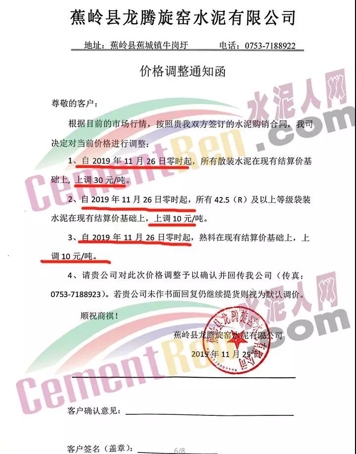 蕉嶺縣龍騰旋窯水泥有限公司發(fā)布了調(diào)價函稱,根據(jù)目前的市場行情,按照貴我雙方簽訂的水泥購銷合同,對水泥價格進行了調(diào)整:自2019年11月26日零時起,所有散裝水泥在現(xiàn)有結(jié)算價基礎(chǔ)上,上調(diào)30元/噸。42.5(R)及以上等級袋裝水泥在現(xiàn)有結(jié)算價基礎(chǔ)上,上調(diào)10元/噸,熟料在現(xiàn)有結(jié)算價基礎(chǔ)上,上調(diào)10元/噸。