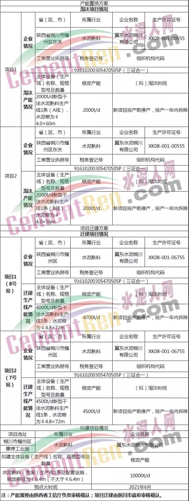 11月22日,陜西省工業(yè)和信息化廳發(fā)布了《關(guān)于冀東水泥銅川有限公司置換方案調(diào)整公告》稱,按照《國(guó)務(wù)院關(guān)于化解產(chǎn)能?chē)?yán)重過(guò)剩矛盾的指導(dǎo)意見(jiàn)》(國(guó)發(fā)〔2013〕41號(hào))和《工信部水泥行業(yè)產(chǎn)能置換實(shí)施辦法》(工信部原〔2017〕337號(hào))精神,以及工信部《關(guān)于陜西省水泥企業(yè)能否執(zhí)行退城入園政策的復(fù)函》(工原函〔2019〕383號(hào))要求,現(xiàn)將冀東水泥銅川有限公司產(chǎn)能置換方案進(jìn)行調(diào)整公告,置換項(xiàng)目在新建項(xiàng)目投產(chǎn)前必須關(guān)停退出,投產(chǎn)一年內(nèi)必須拆除。產(chǎn)能置換方案如下: