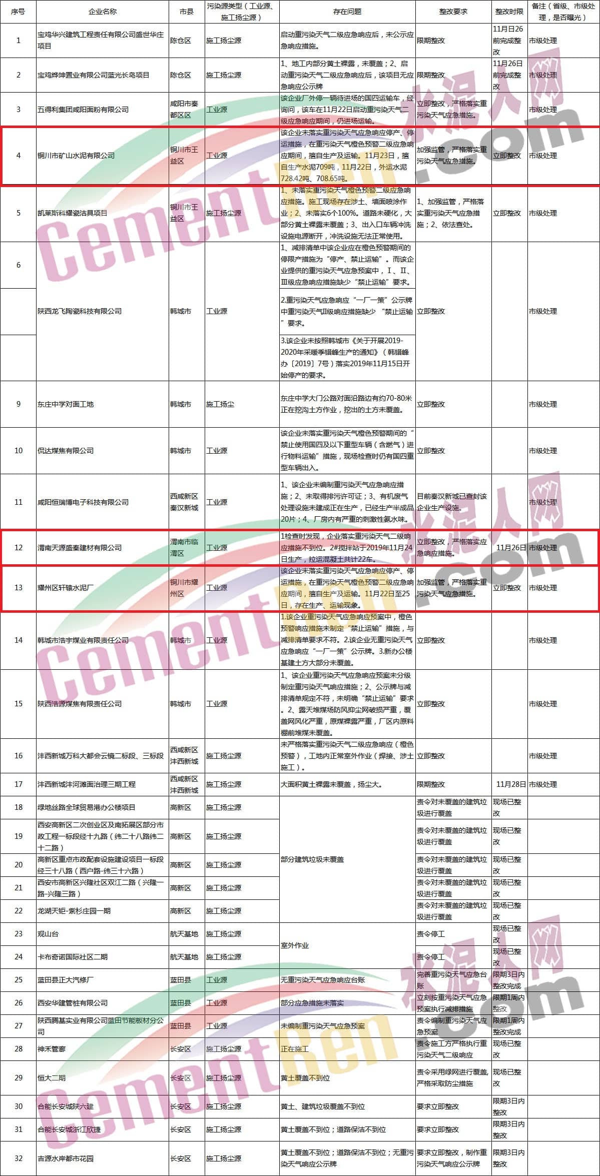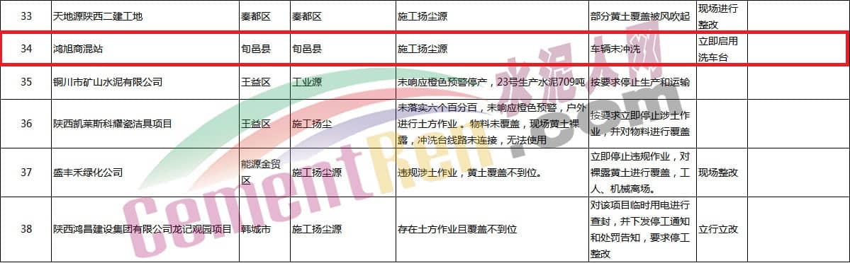 日前,水泥人網(wǎng)自陜西省生態(tài)環(huán)境廳獲悉,按照陜西省重污染天氣應(yīng)急指揮部辦公室《關(guān)于提示應(yīng)對重污染天氣的函》要求,陜西省生態(tài)環(huán)境執(zhí)法總隊及各市區(qū)執(zhí)法部門對重污染天氣應(yīng)急響應(yīng)措施執(zhí)行情況進(jìn)行了專項執(zhí)法檢查,相關(guān)檢查問題匯總?cè)缦拢?