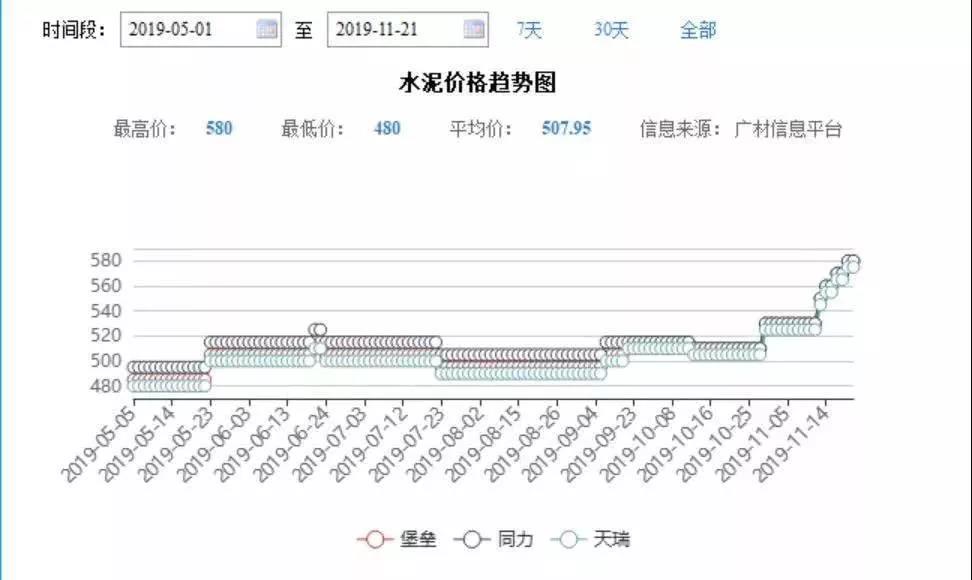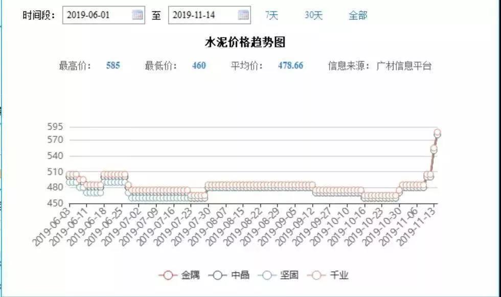 11 月 22 日,記者在信息網(wǎng)上查詢的數(shù)據(jù)顯示,山東水泥價格前期緩步上漲,進(jìn)入 11 月份后價格漲勢趨于明顯,最高價格為 555 元 / 噸,11 月中下旬以來價格仍在高位徘徊。