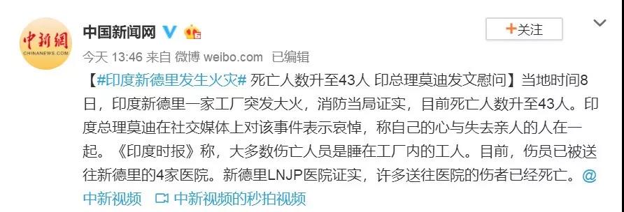 據外媒報道,當地時間12月8日(昨日),印度新德里一家工廠突發(fā)大火,消防當局證實,目前死亡人數升至43人。