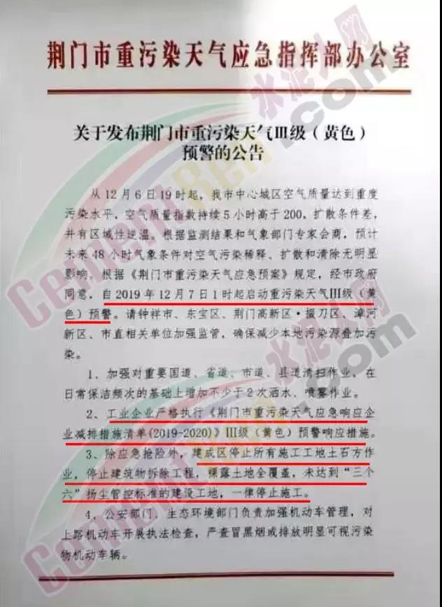 湖北荊門市重污染天應(yīng)急指揮部辦公室發(fā)布《荊門市重污染天氣III級(黃色)預(yù)警的公告》稱,自12月6日19時起,荊門市中心城區(qū)空氣質(zhì)量達(dá)到重度污染水平,經(jīng)市政府同意,自2019年12月7日1時起啟動重污染天氣III級預(yù)警。除應(yīng)急搶險外,建成區(qū)停止所有施工工地土石方作業(yè),停止建筑物拆除工程,裸露土全覆蓋,未達(dá)到“三六”揚(yáng)塵管控標(biāo)準(zhǔn)的建設(shè)工地,一律停止施工。